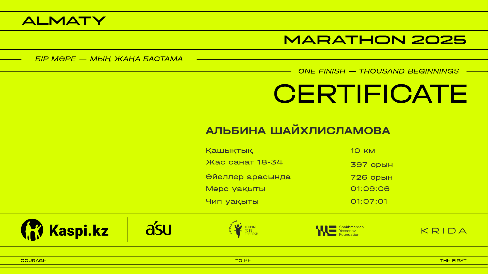 | 2536 | Альбина Шайхлисламова | ![]() | Алматы | 10810 | 00:58:39 | 01:09:06 | 01:07:01 | Жүктеп алу |