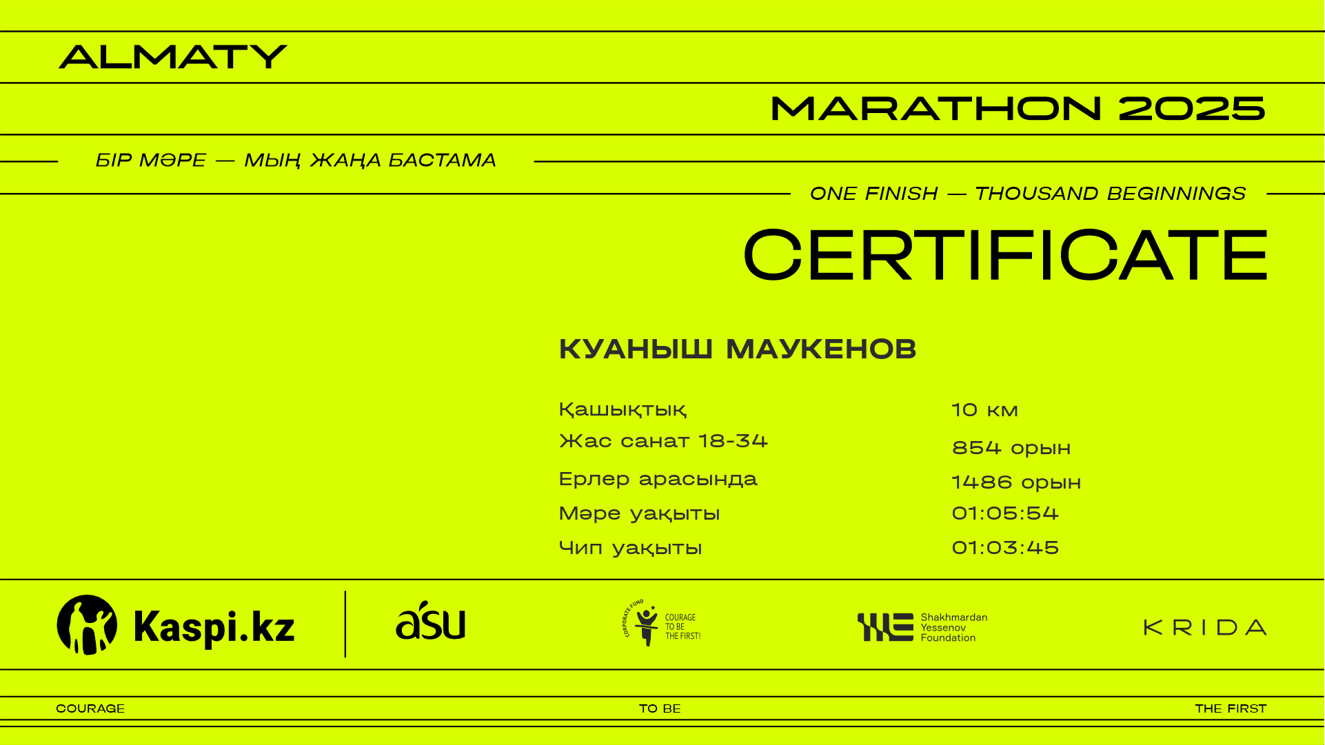 | 2019 | Куаныш Маукенов | ![]() | Алматы | 9876 | 00:55:49 | 01:05:54 | 01:03:45 | Жүктеп алу |