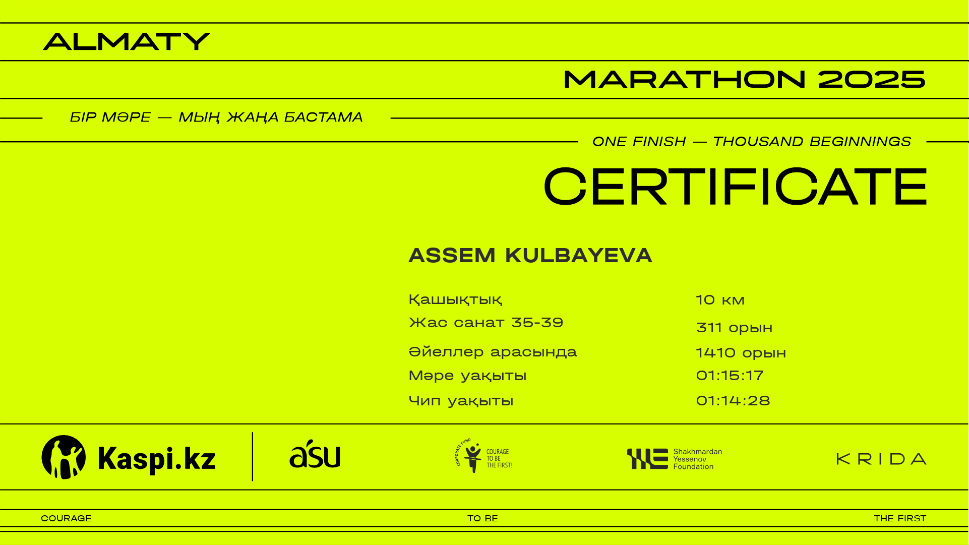 | 6491 | Assyl Nygmetzhanova | ![]() | Алматы | 9581 | 01:26:12 | 01:39:25 | 01:37:28 | Жүктеп алу |