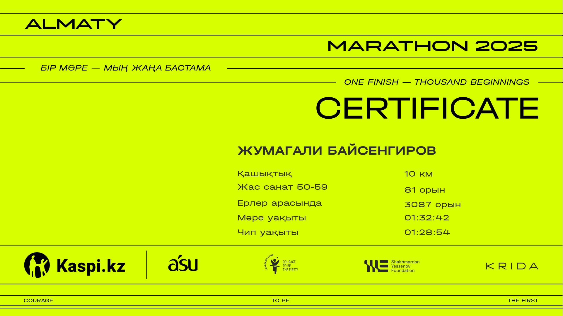 | 5881 | Жумагали Байсенгиров | ![]() | Алматы | 9899 | 01:18:29 | 01:32:42 | 01:28:54 | Жүктеп алу |