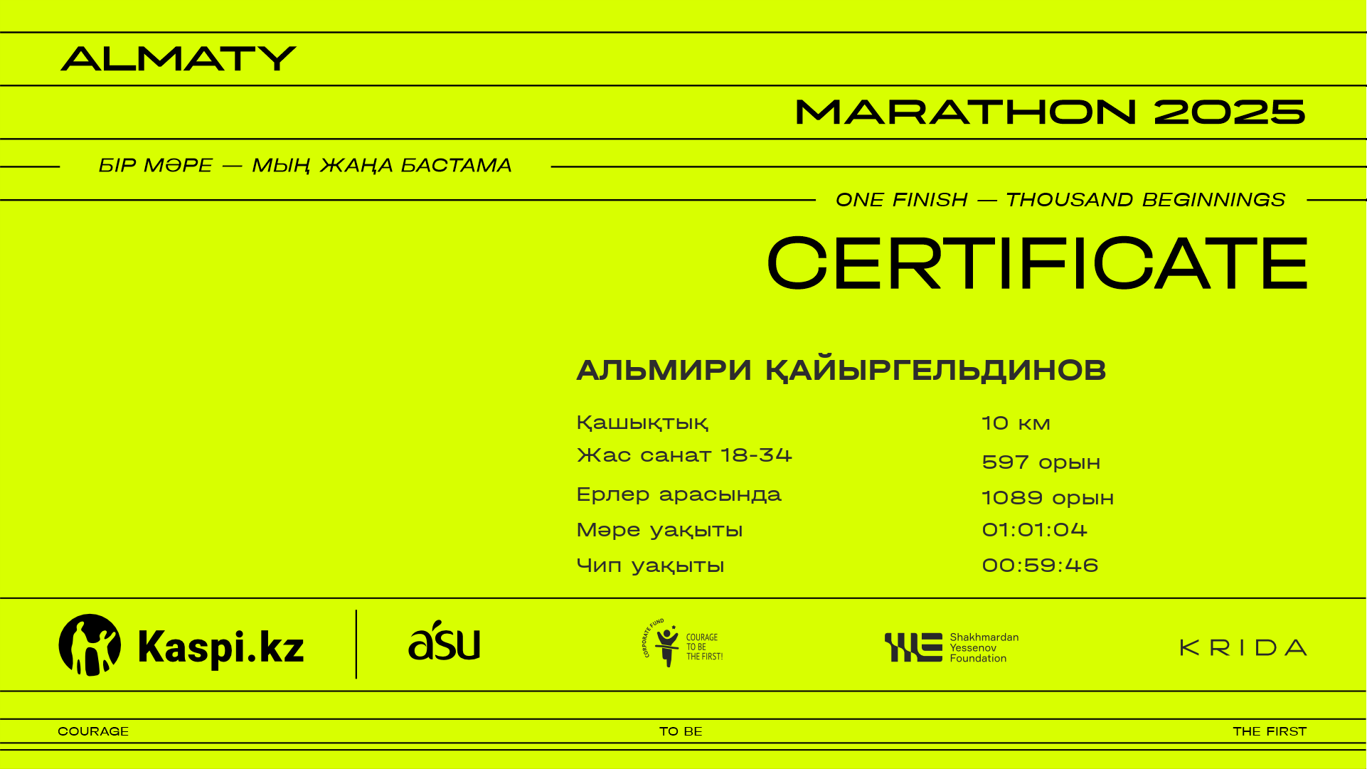 | 6851 | Кормалыга Валерия | ![]() | Алматы | 13298 | 01:35:18 | 01:48:00 | 01:47:20 | Жүктеп алу |