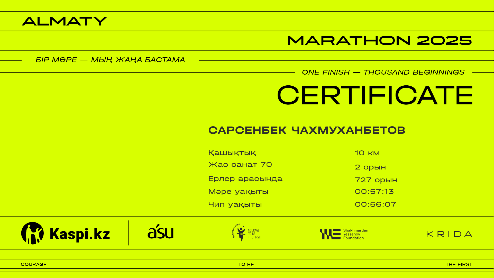 | 1020 | Саябек Гумаров | ![]() | Алматы | 8485 | 00:49:42 | 00:57:24 | 00:57:04 | Жүктеп алу |