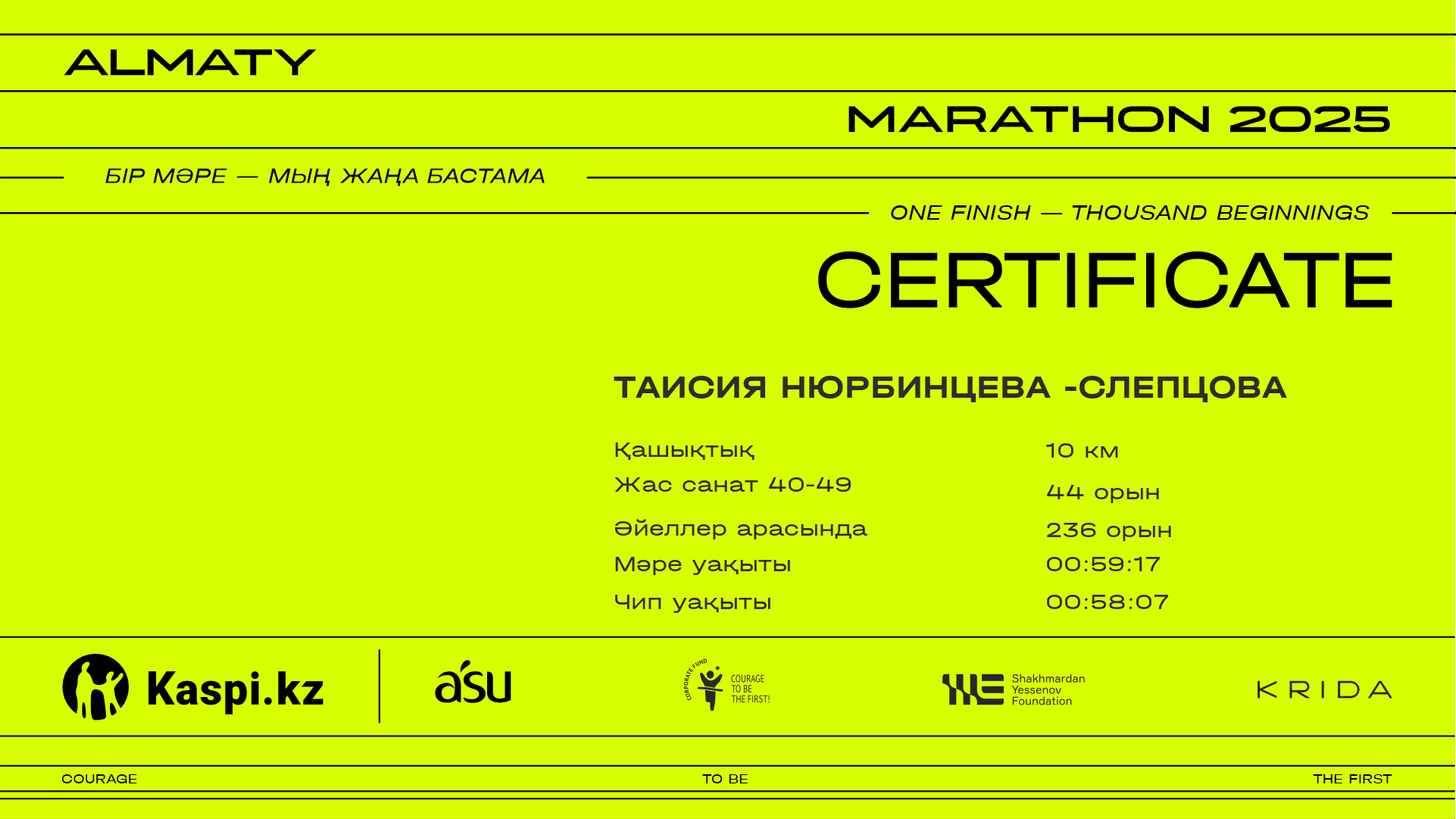 | 5255 | Сымбат Пралиева | ![]() | Алматы | 13542 | 01:13:31 | 01:25:34 | 01:23:22 | Жүктеп алу |