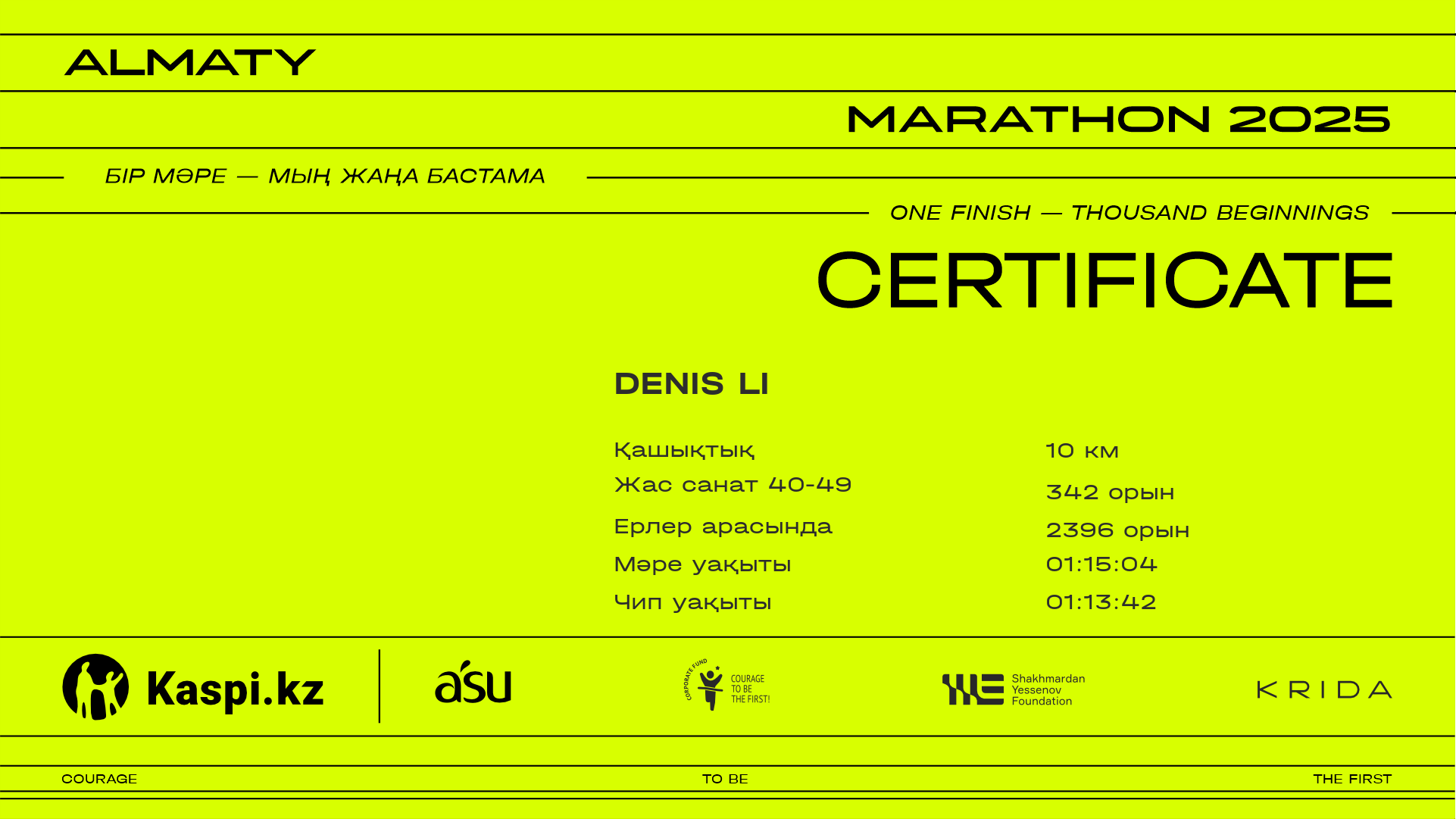 | 3674 | Deniz Kochiyev | ![]() | Алматы | 10801 | 01:04:54 | 01:13:57 | 01:13:22 | Жүктеп алу |