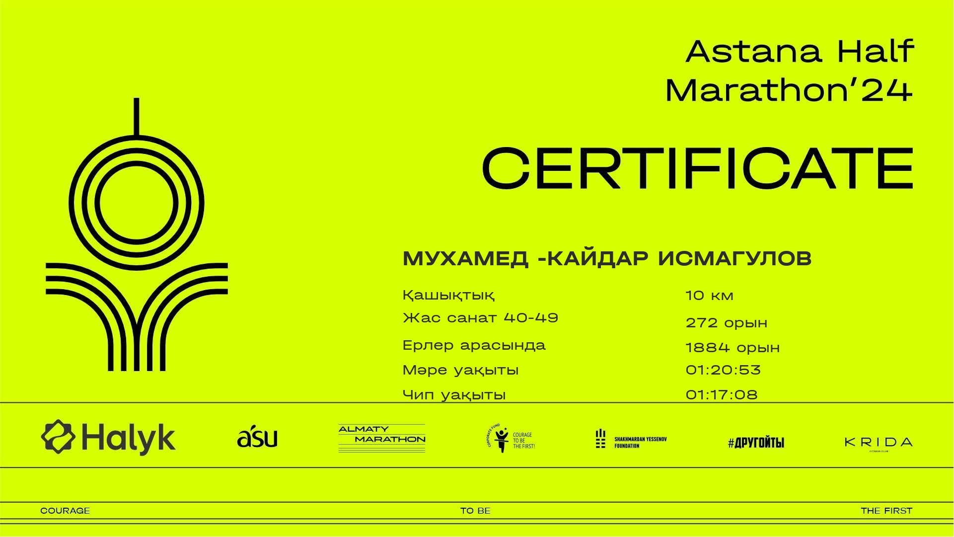| 1800 | Мухит Куанышбайулы | ![]() | Астана | 5727 | 00:22:46.75 | 00:59:43.03 | 01:08:46.09 | 01:08:07.17 | Жүктеп алу |