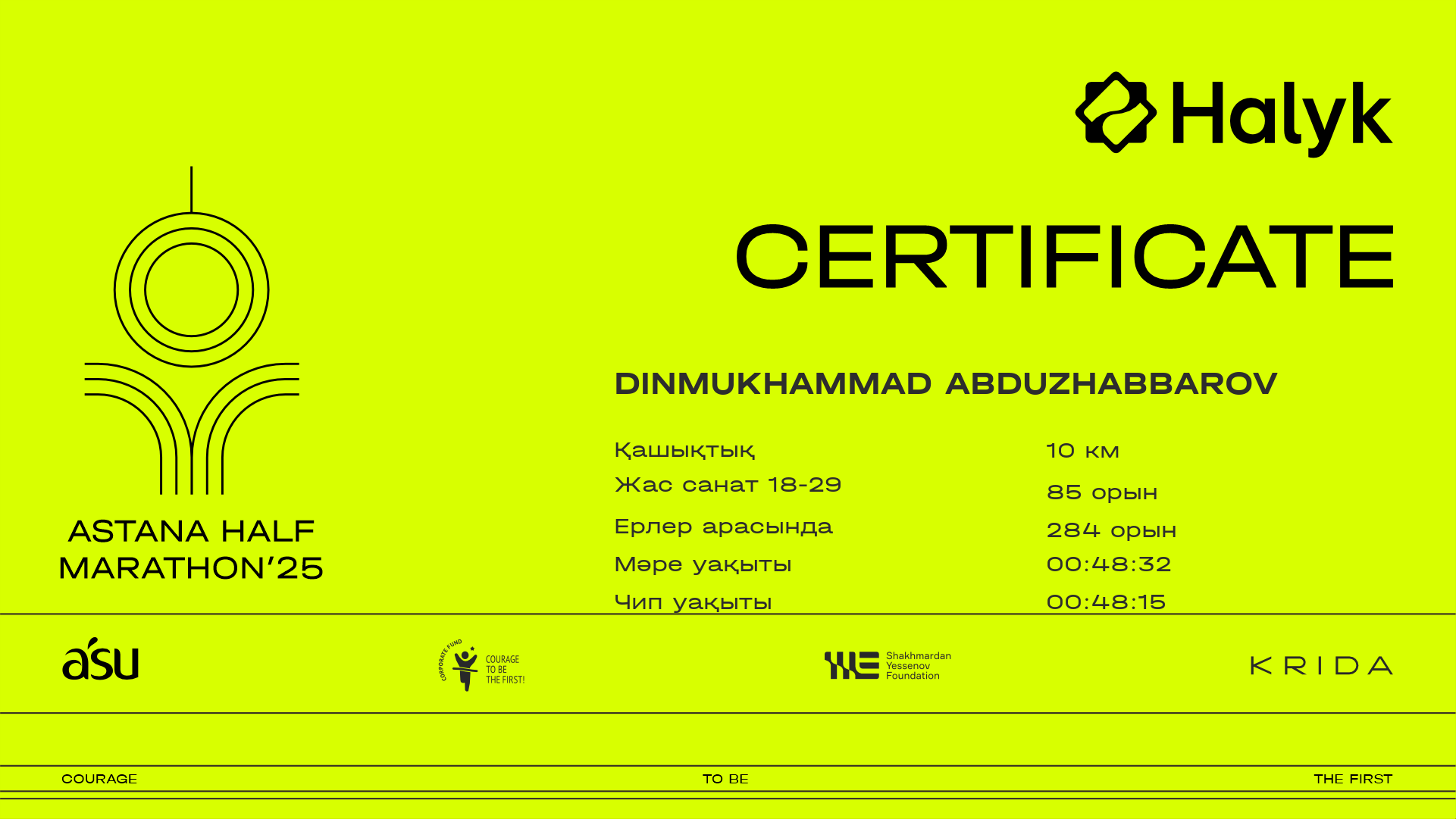 | 331 | Dinmukhammad Abduzhabbarov | ![]() | Алматы | 3416 | 00:27:07 | 00:48:32 | 00:48:15 | Жүктеп алу |