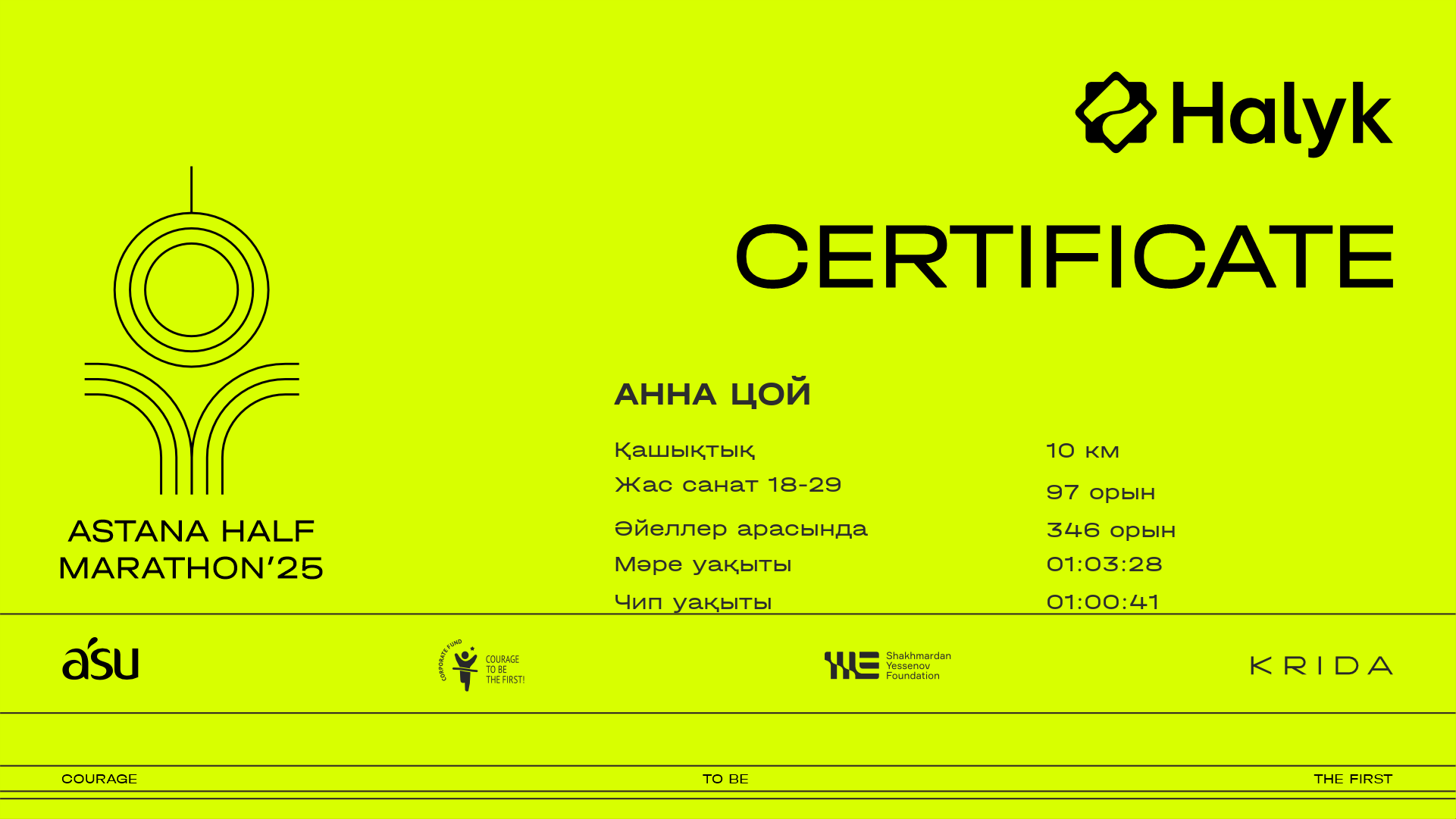 | 3356 | Акерке Кусанова | ![]() | Астана | 5735 | 00:52:00 | 01:26:36 | 01:24:21 | Жүктеп алу |