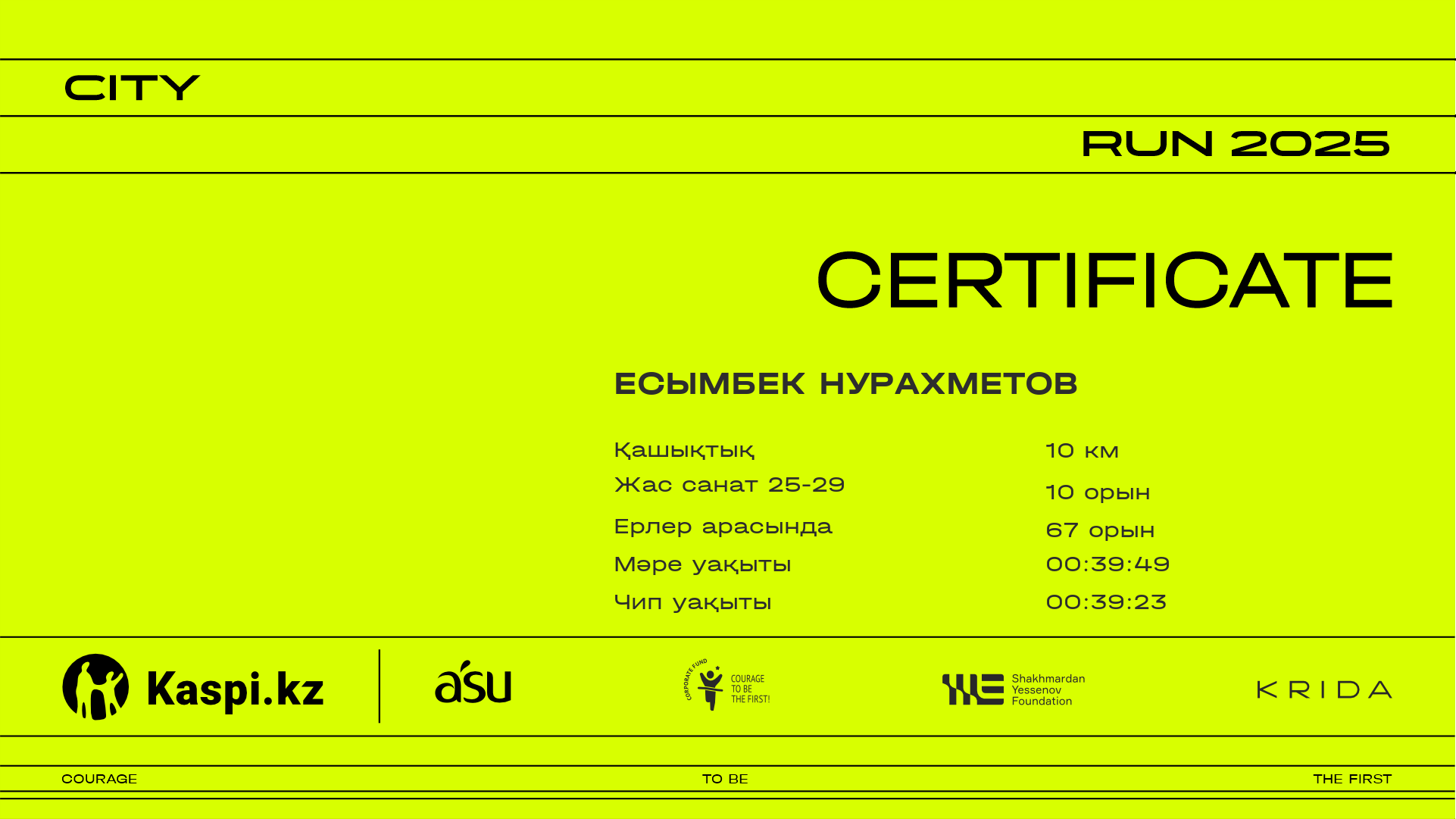 ОрынҚатысушыЕлҚалаНөмір2.52 km4.37 km6.4 km8.43 km9.84 kmФинишУақыт чипіСертификат