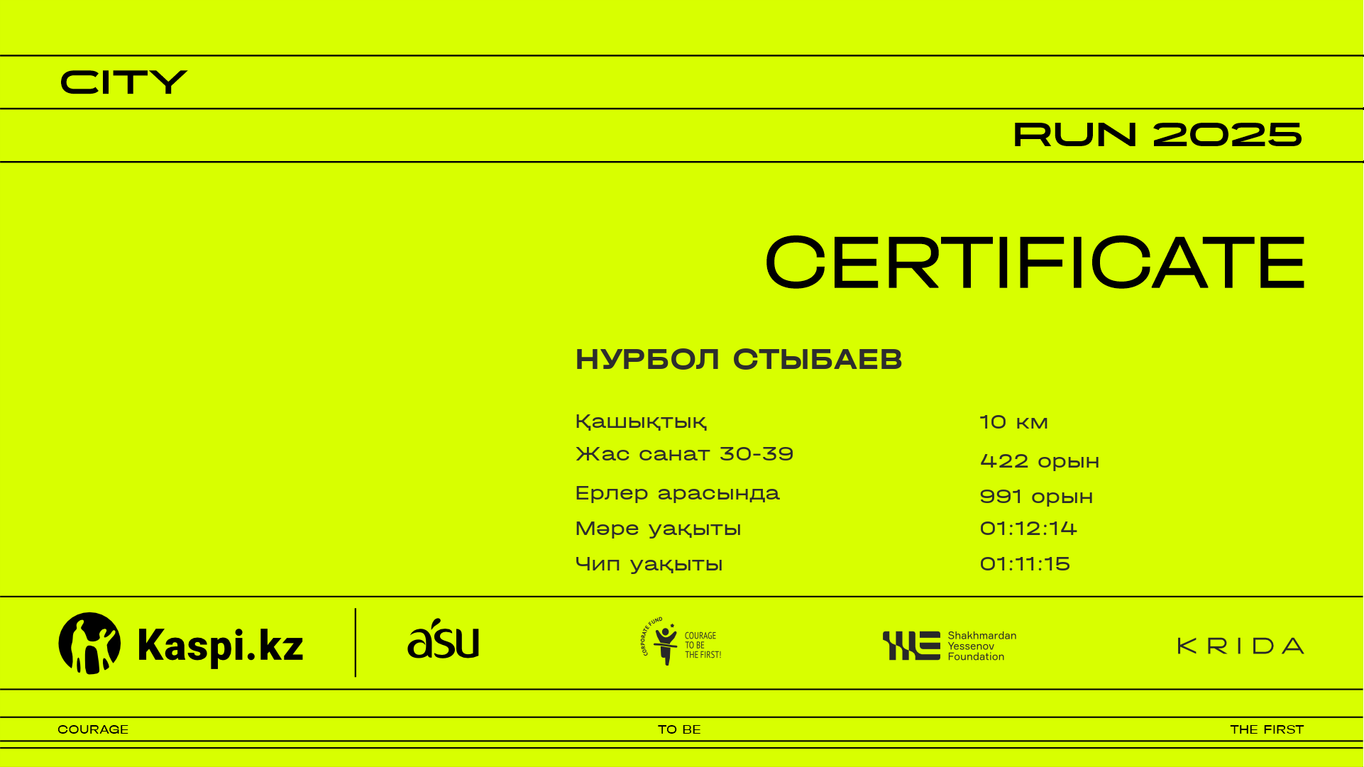 | 1498 | Нурбол Стыбаев | ![]() | Алматы | 1391 | 00:20:02 | 00:32:50 | 00:46:25 | 01:00:00 | 01:10:33 | 01:12:14 | 01:11:15 | Жүктеп алу |