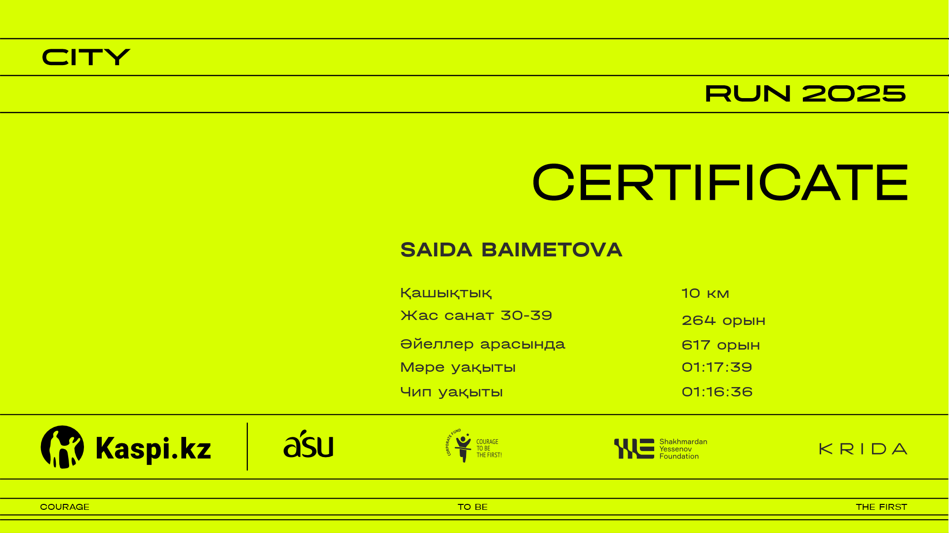 | 1673 | Александра Павленко | ![]() | Алматы | 233 | 00:19:40 | 00:32:31 | 00:47:02 | 01:02:54 | 01:15:34 | 01:17:24 | 01:16:29 | Жүктеп алу |