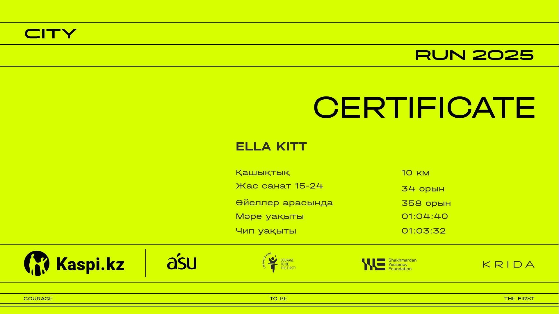 | 1398 | Firyuza Dzhaparova | ![]() | Almaty | 390 | 00:16:32 | 00:28:10 | 00:41:34 | 00:56:21 | 01:08:09 | 01:09:38 | 01:09:21 | Жүктеп алу |