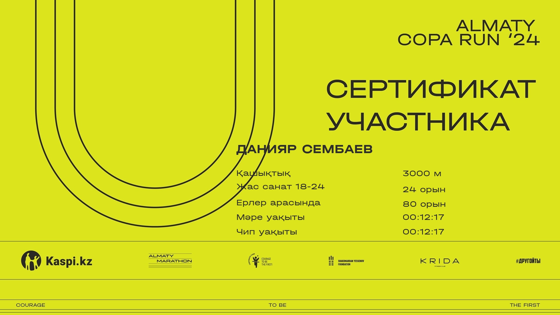 | 85 | Данияр Сембаев | ![]() | Алматы | 687 | 00:12:17.8 | Жүктеп алу |