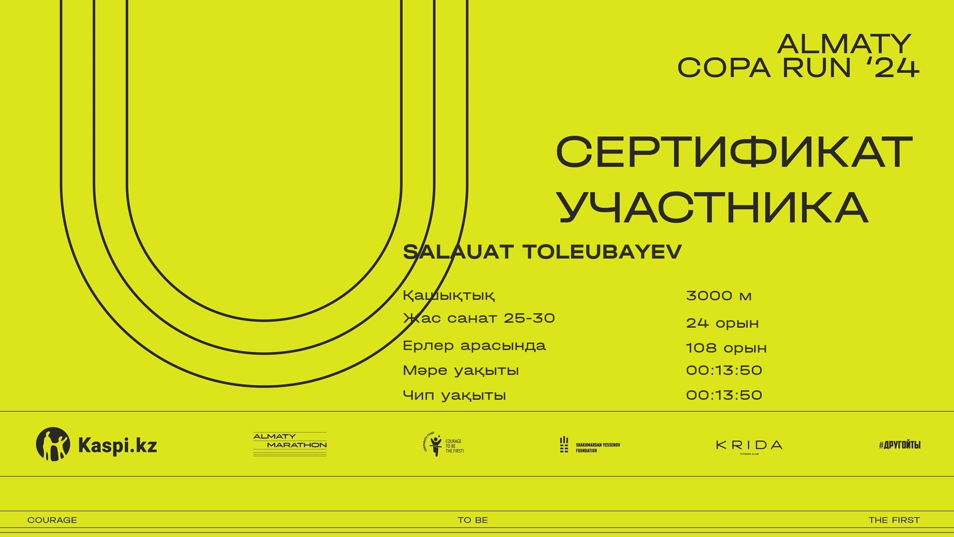 | 127 | Salauat Toleubayev | ![]() | Алматы | 452 | 00:13:50.8 | Жүктеп алу |