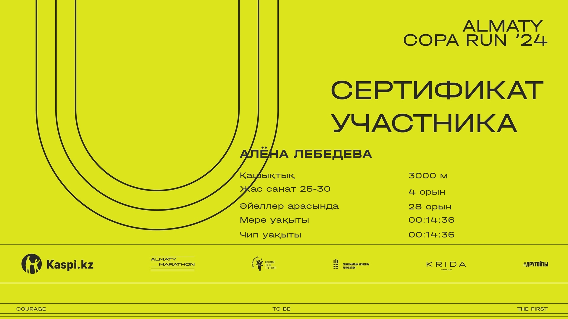 | 143 | Алёна Лебедева | ![]() | Алматы | 541 | 00:14:36.3 | Жүктеп алу |
