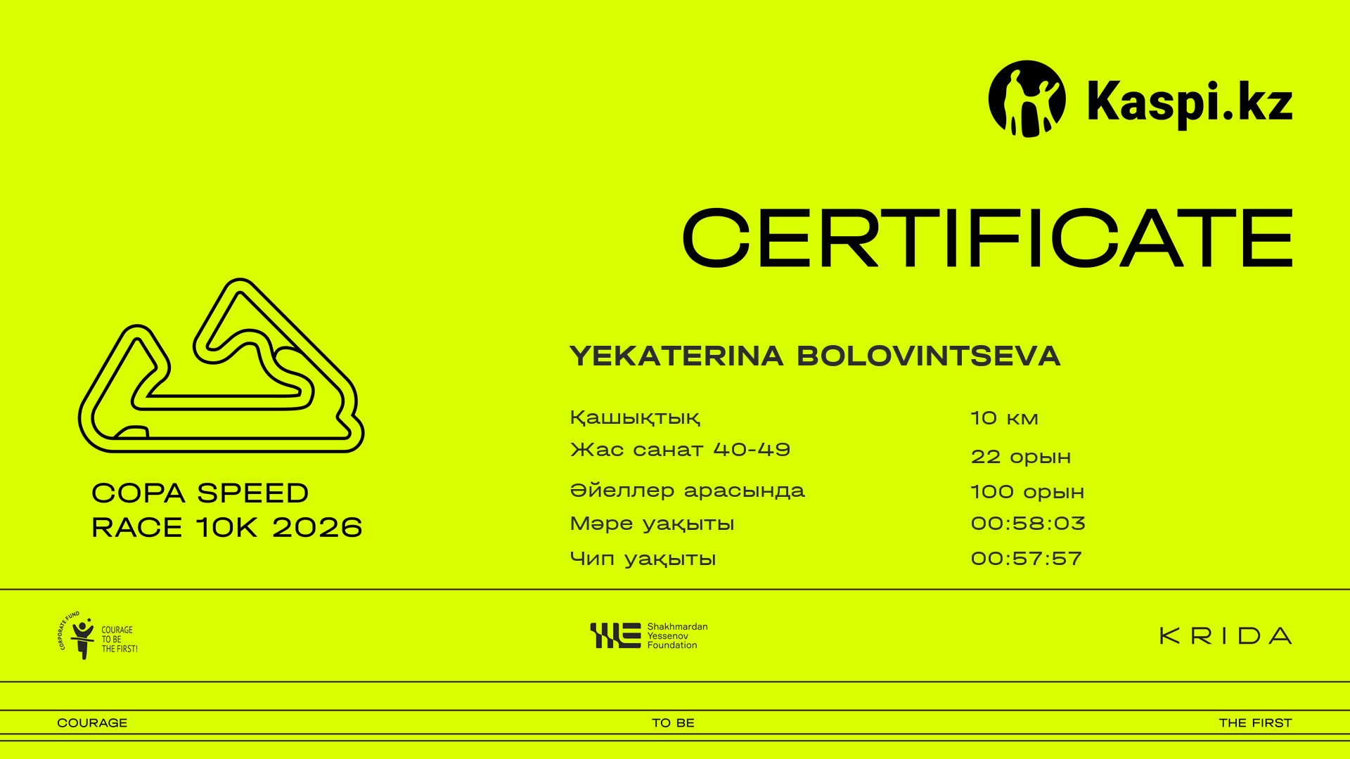 ОрынҚатысушыЕлҚалаНөмір2 km3.8 km5 km7 km8.8 kmФинишУақыт чипіСертификат