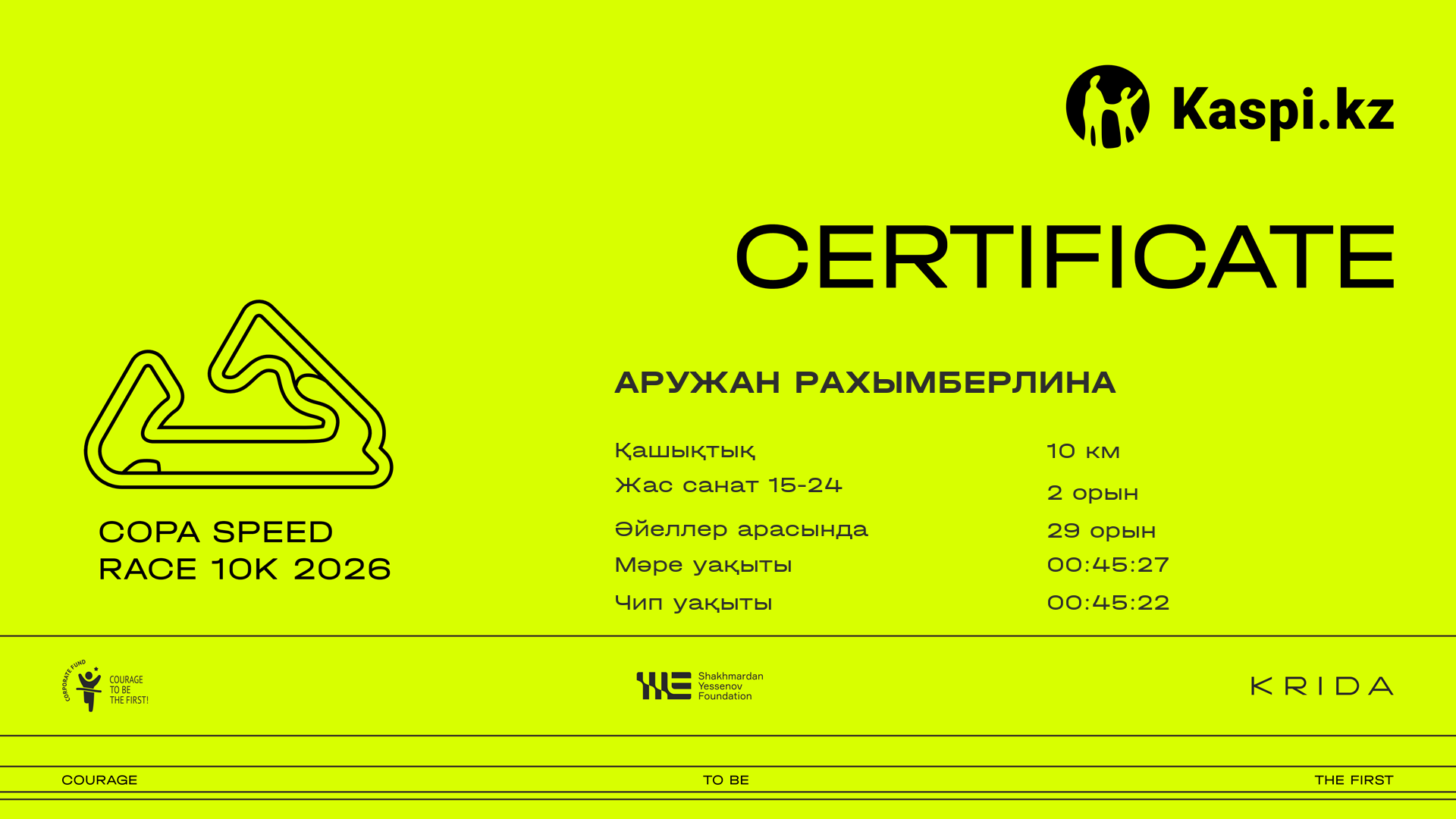ОрынҚатысушыЕлҚалаНөмір2 km3.8 km5 km7 km8.8 kmФинишУақыт чипіСертификат