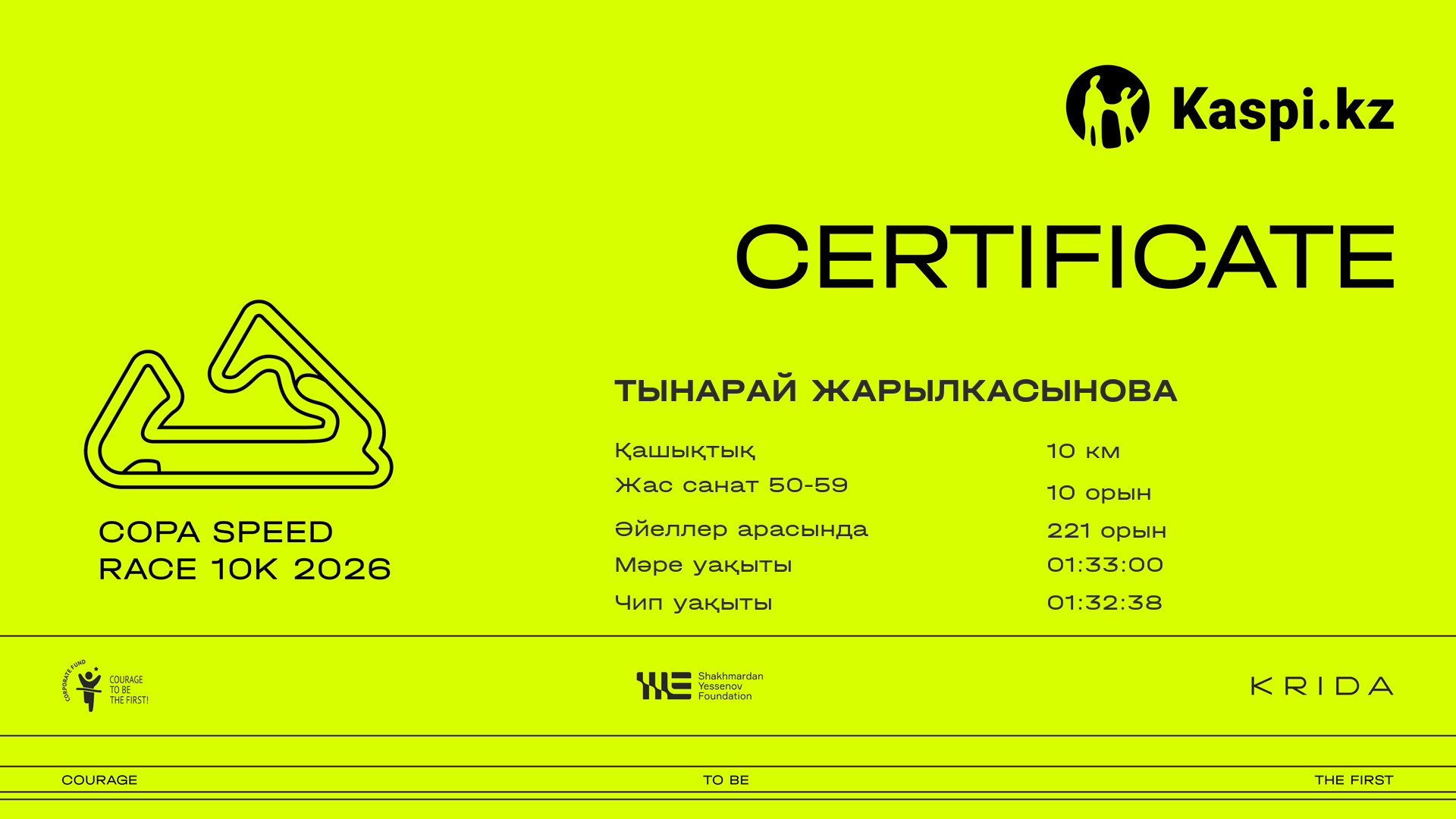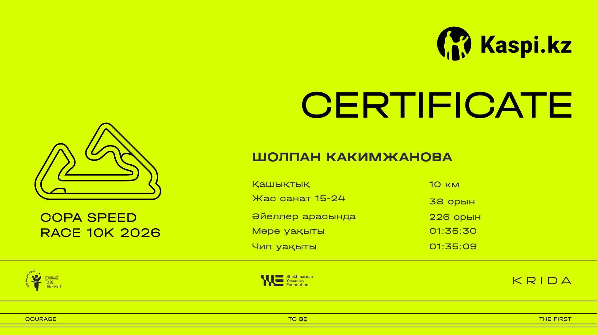 ОрынҚатысушыЕлҚалаНөмір2 km3.8 km5 km7 km8.8 kmФинишУақыт чипіСертификат