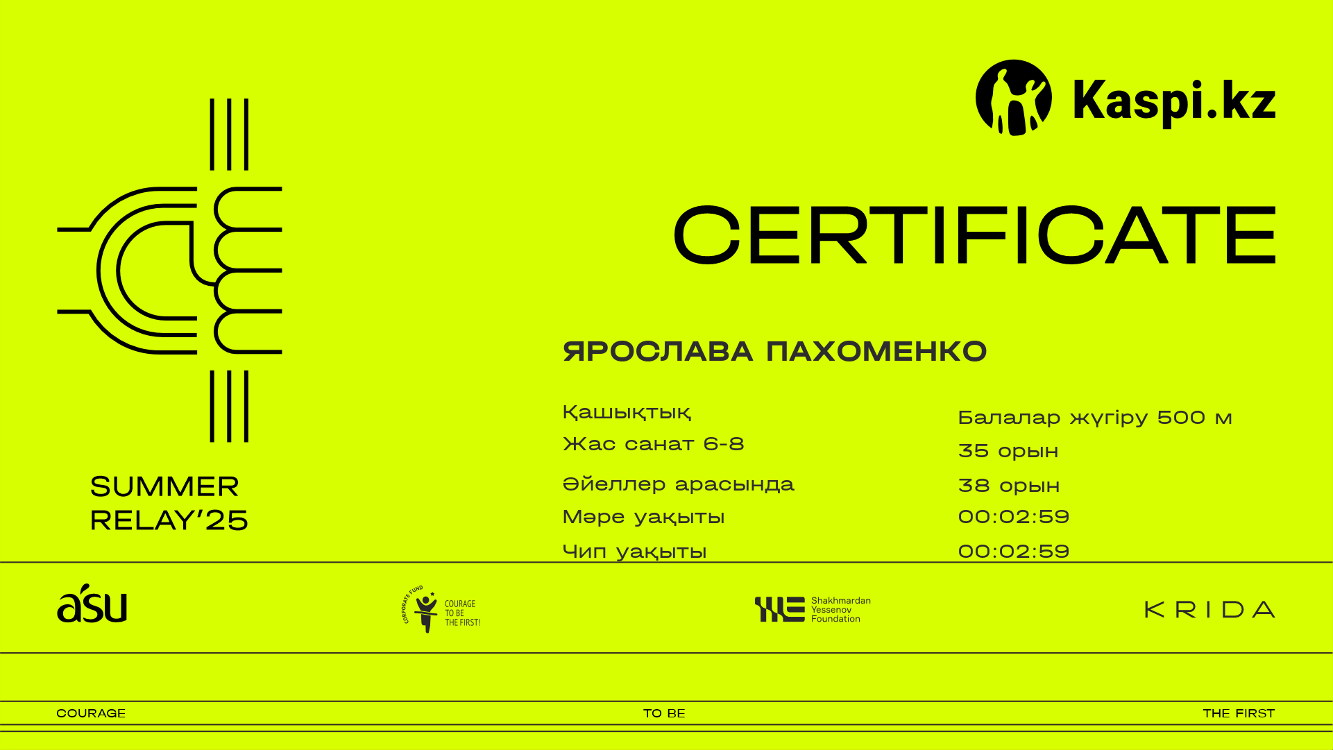 | 113 | Arsen Kozhan | ![]() | Алматы | 25 | 00:03:14.10 | 00:03:13.70 | Жүктеп алу |