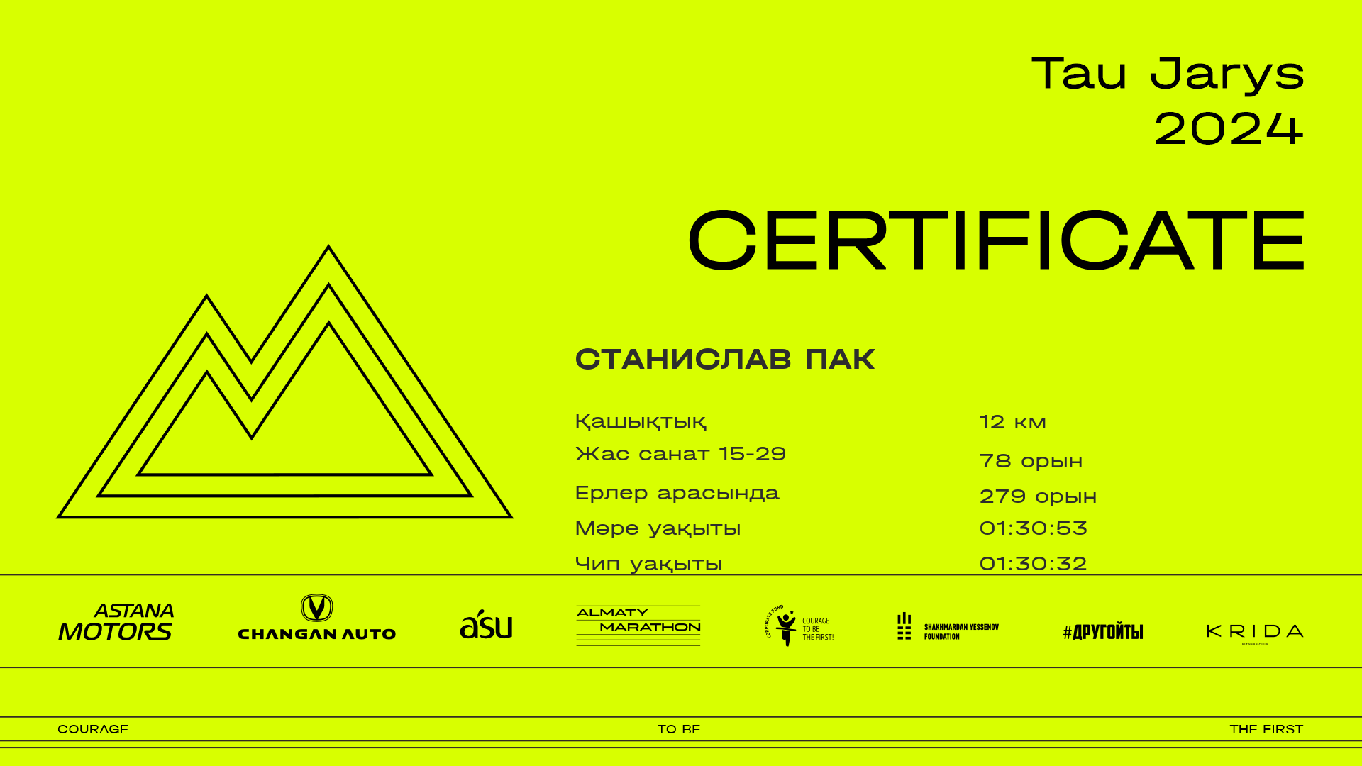 | 330 | Станислав Пак | ![]() | Алматы | 163 | 00:12:08.70 | 00:31:25.30 | 00:59:13.69 | 01:17:35.79 | 01:30:53.23 | 01:30:32.72 | Жүктеп алу |