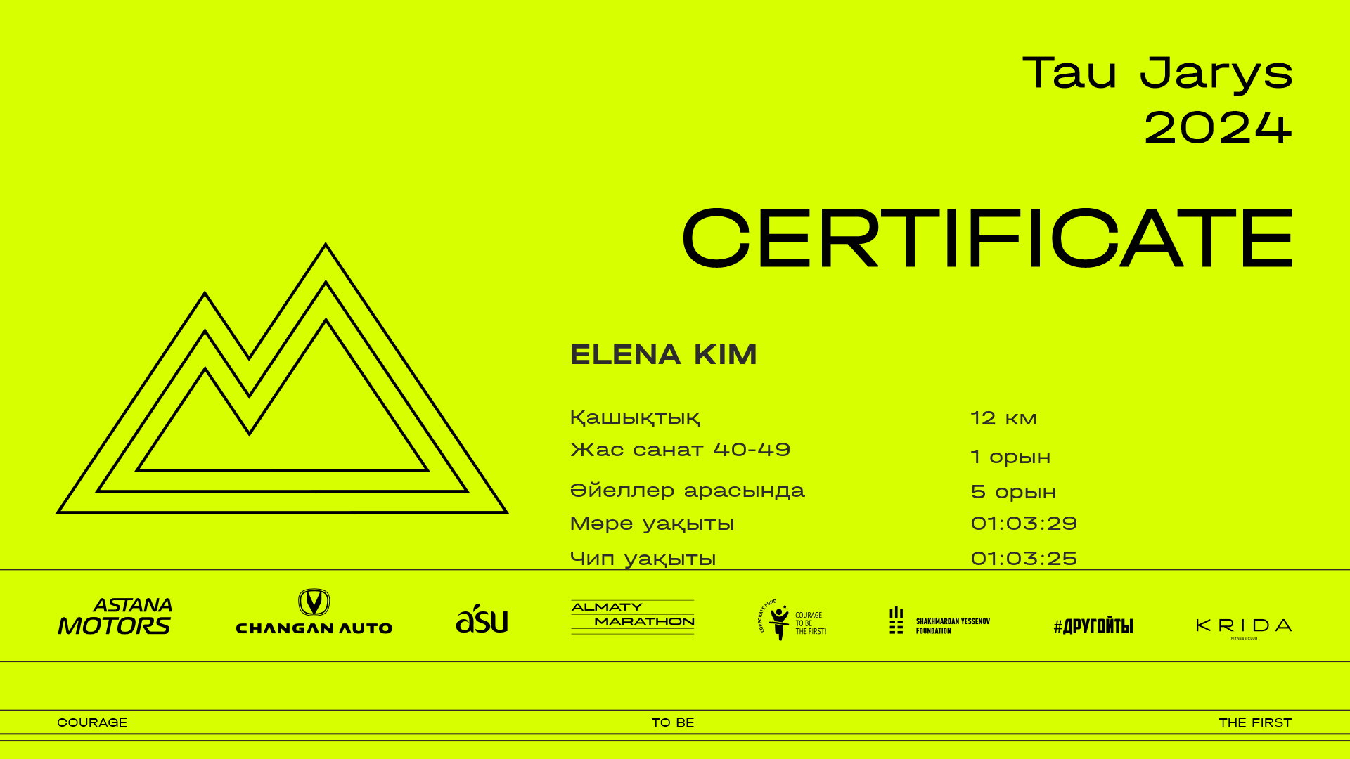 | 59 | Elena Kim | ![]() | Алматы | 136 | 00:08:29.59 | 00:21:23.78 | 00:40:12.66 | 00:53:34.96 | 01:03:29.96 | 01:03:25.56 | Жүктеп алу |