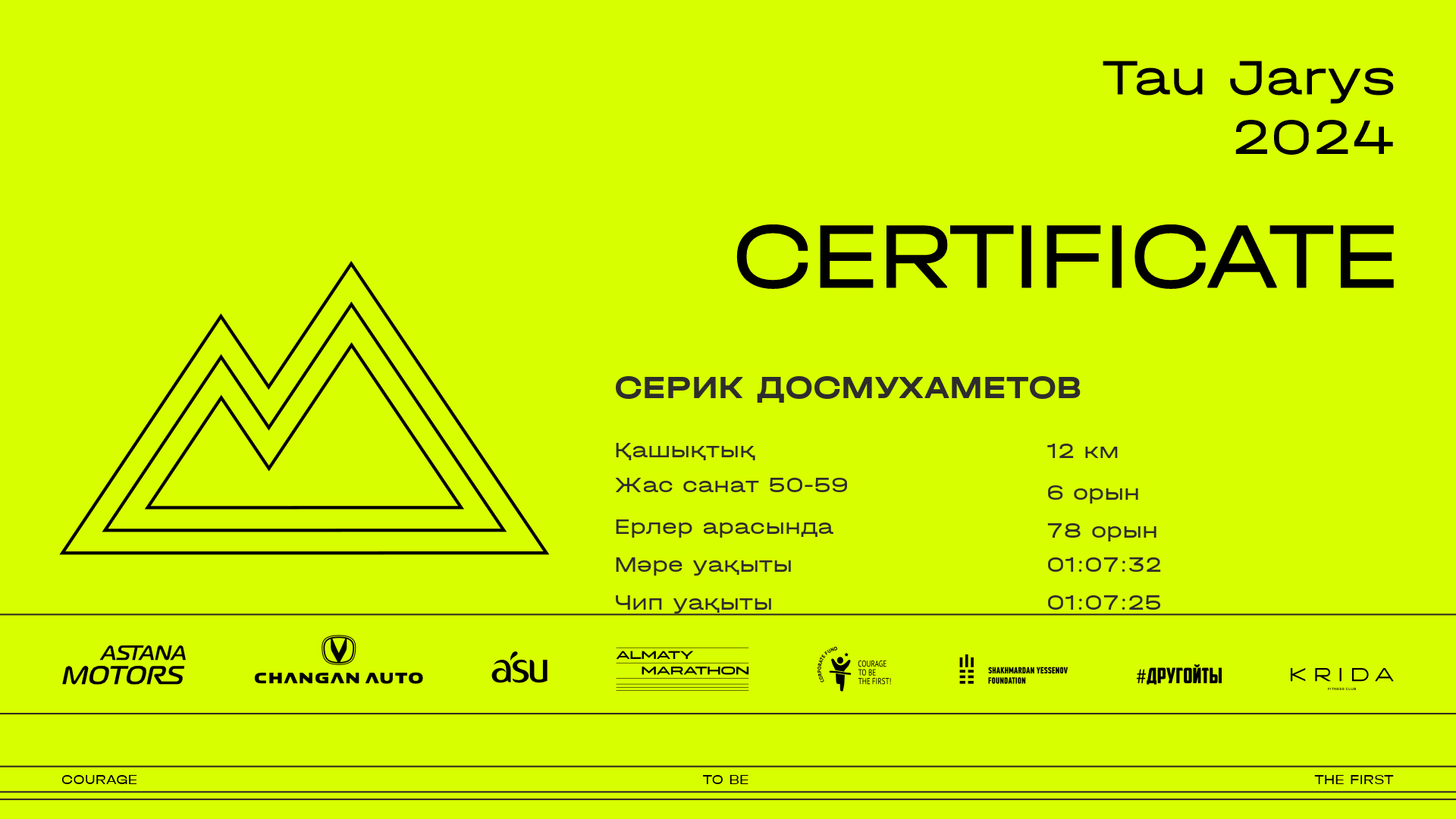 | 87 | Bagytzhan Kozhrakov | ![]() | Алматы | 414 | 00:09:06.51 | 00:22:30.99 | 00:42:42.24 | 00:56:38.27 | 01:07:42.14 | 01:07:37.27 | Жүктеп алу |