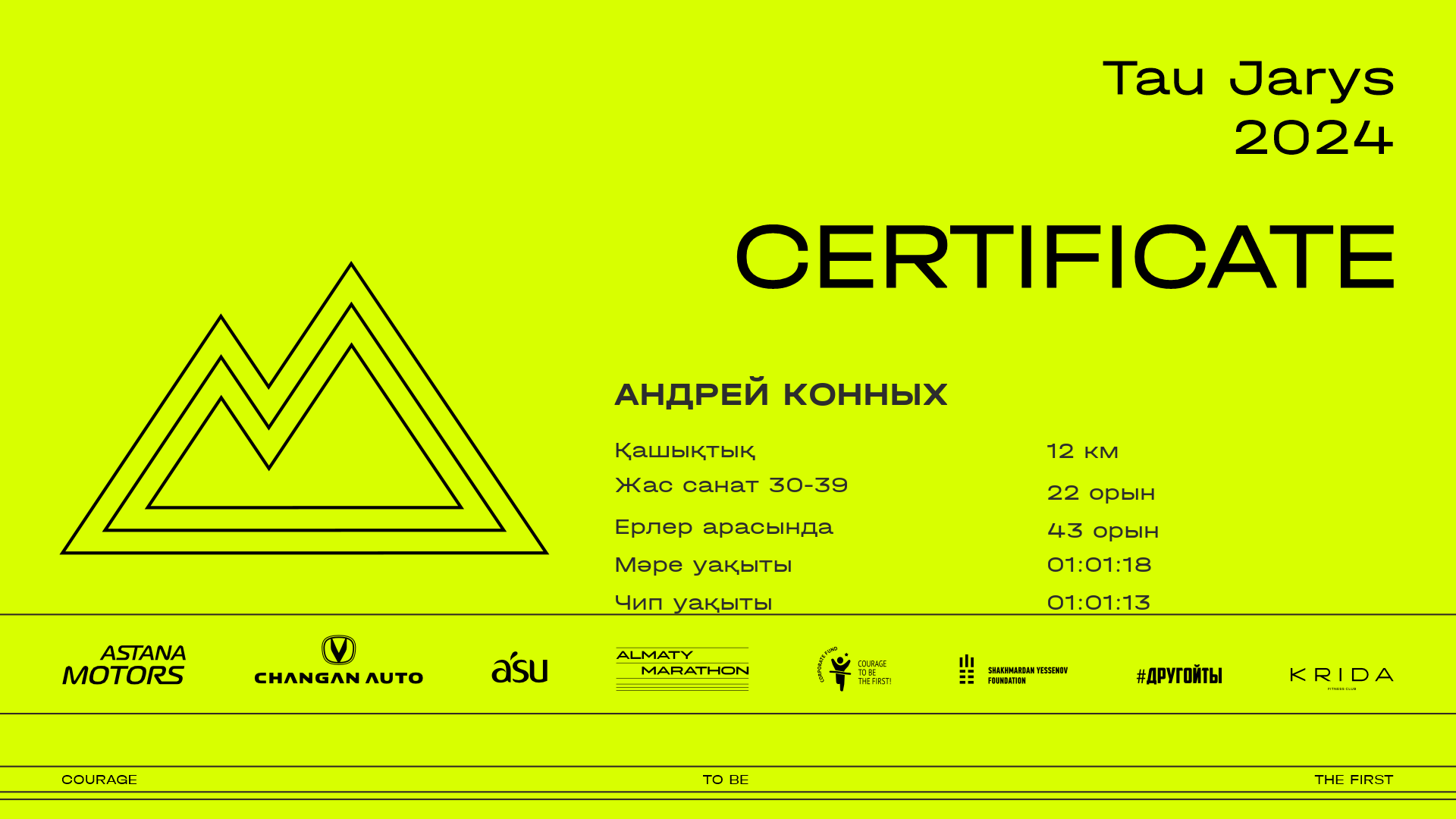 | 107 | Andrey Komarov | ![]() | Алматы | 44 | 00:08:10.17 | 00:21:31.26 | 00:42:25.55 | 00:58:12.40 | 01:10:32.03 | 01:10:32.03 | Жүктеп алу |