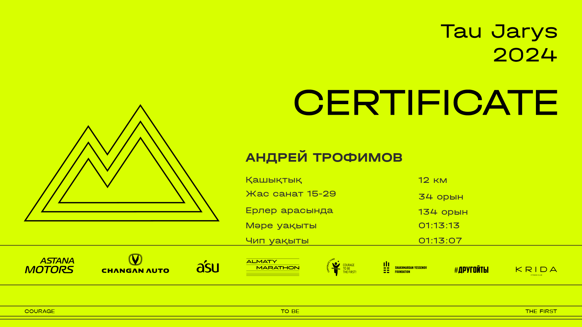 | 149 | Андрей Трофимов | ![]() | Алматы | 378 | 00:09:25.62 | 00:24:37.75 | 00:47:03.50 | 01:02:11.39 | 01:13:13.45 | 01:13:07.97 | Жүктеп алу |