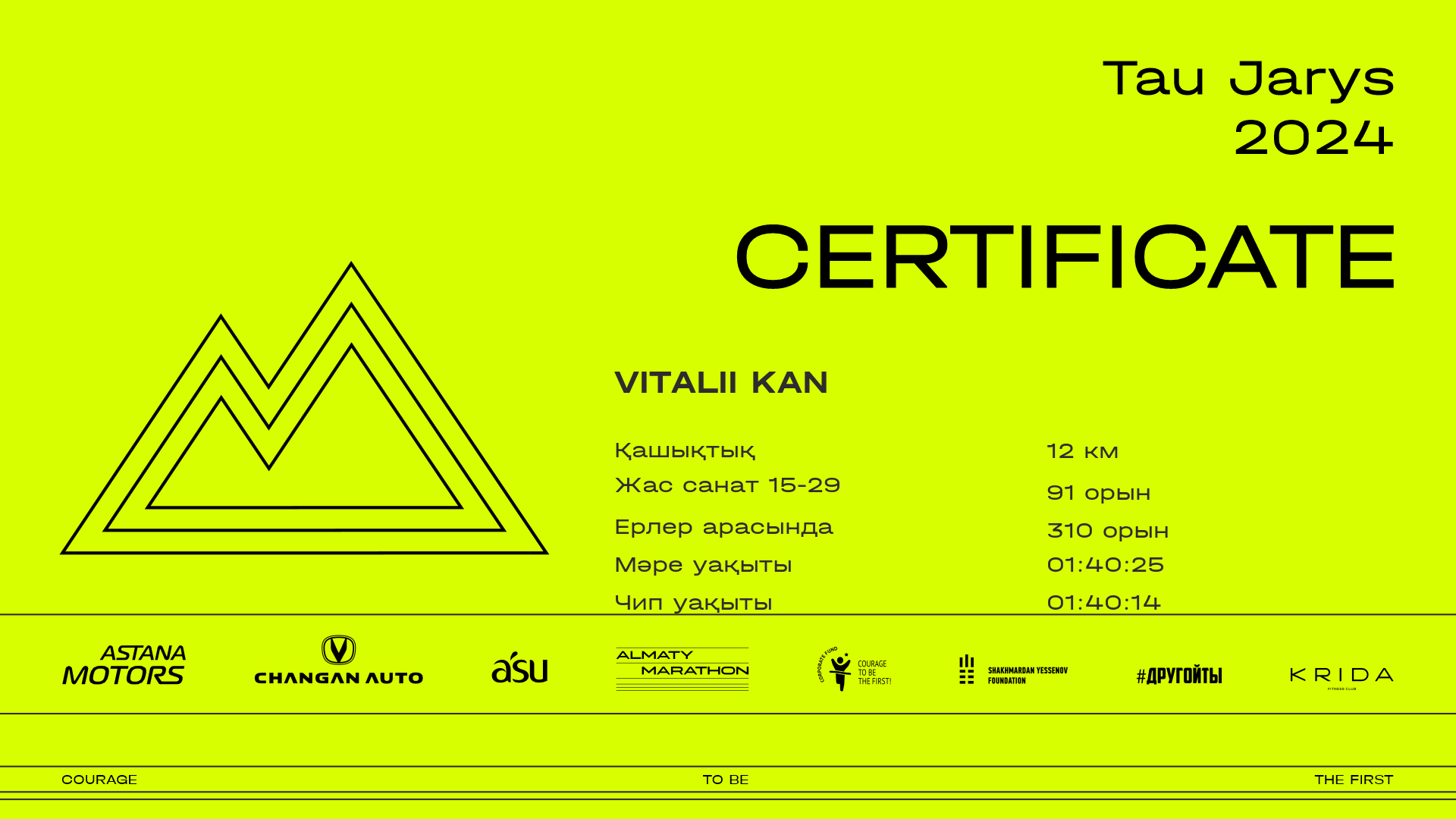| 399 | Elkanat Jenishanuly | ![]() | Алматы | 148 | 00:12:05.41 | 00:33:18.32 | 01:10:34.82 | 01:32:22.55 | 01:49:06.18 | 01:48:46.95 | Жүктеп алу |