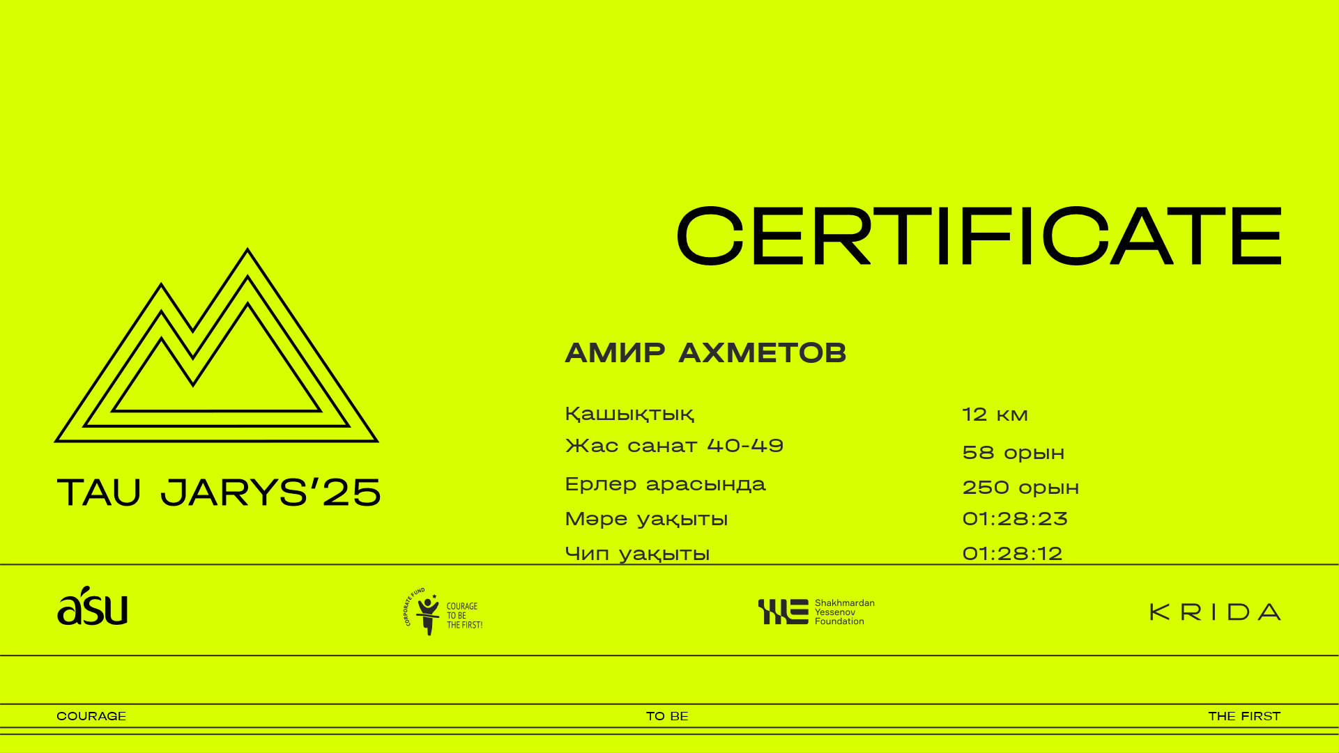 | 284 | Амир Ахметов | ![]() | Алматы | 332 | 00:11:14.20 | 00:28:10.40 | 00:37:28.20 | 00:56:12.90 | 01:13:09.10 | 01:21:26.60 | 01:28:23.40 | 01:28:12.90 | Жүктеп алу |