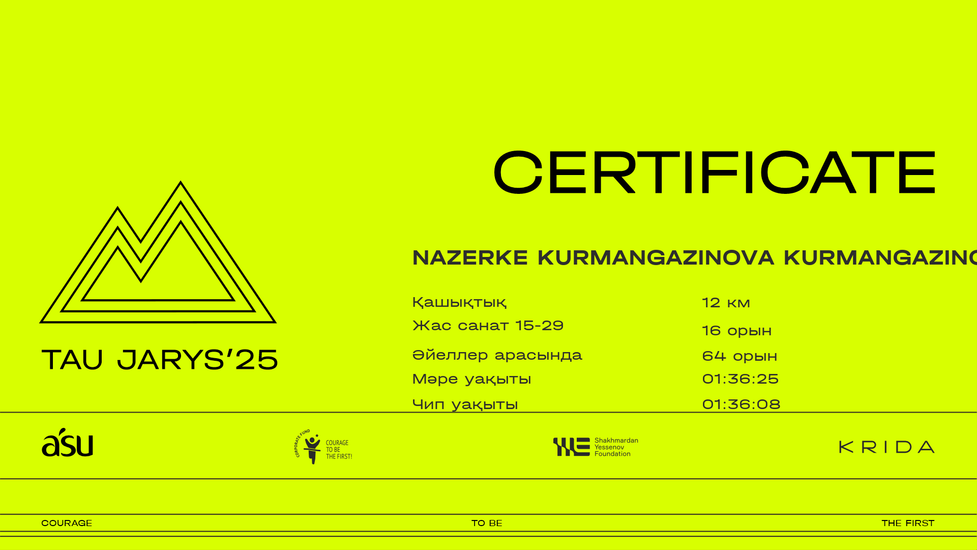 | 364 | Nazerke Kurmangazinova Kurmangazinova | ![]() | Алматы | 408 | 00:12:27.50 | 00:29:46.20 | 00:38:25.00 | 00:58:10.80 | 01:17:38.20 | 01:27:34.40 | 01:36:25.60 | 01:36:08.40 | Жүктеп алу |