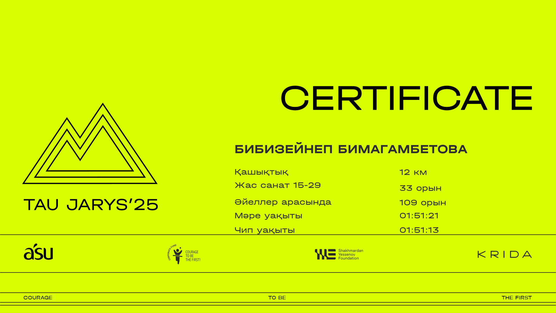 | 498 | Zhulduz Kyrgyzalina | ![]() | Астана | 245 | 00:14:03 | 00:35:24 | 00:46:36 | 01:13:09 | 01:37:57 | 01:50:01 | 01:59:53 | 01:59:34 | Жүктеп алу |