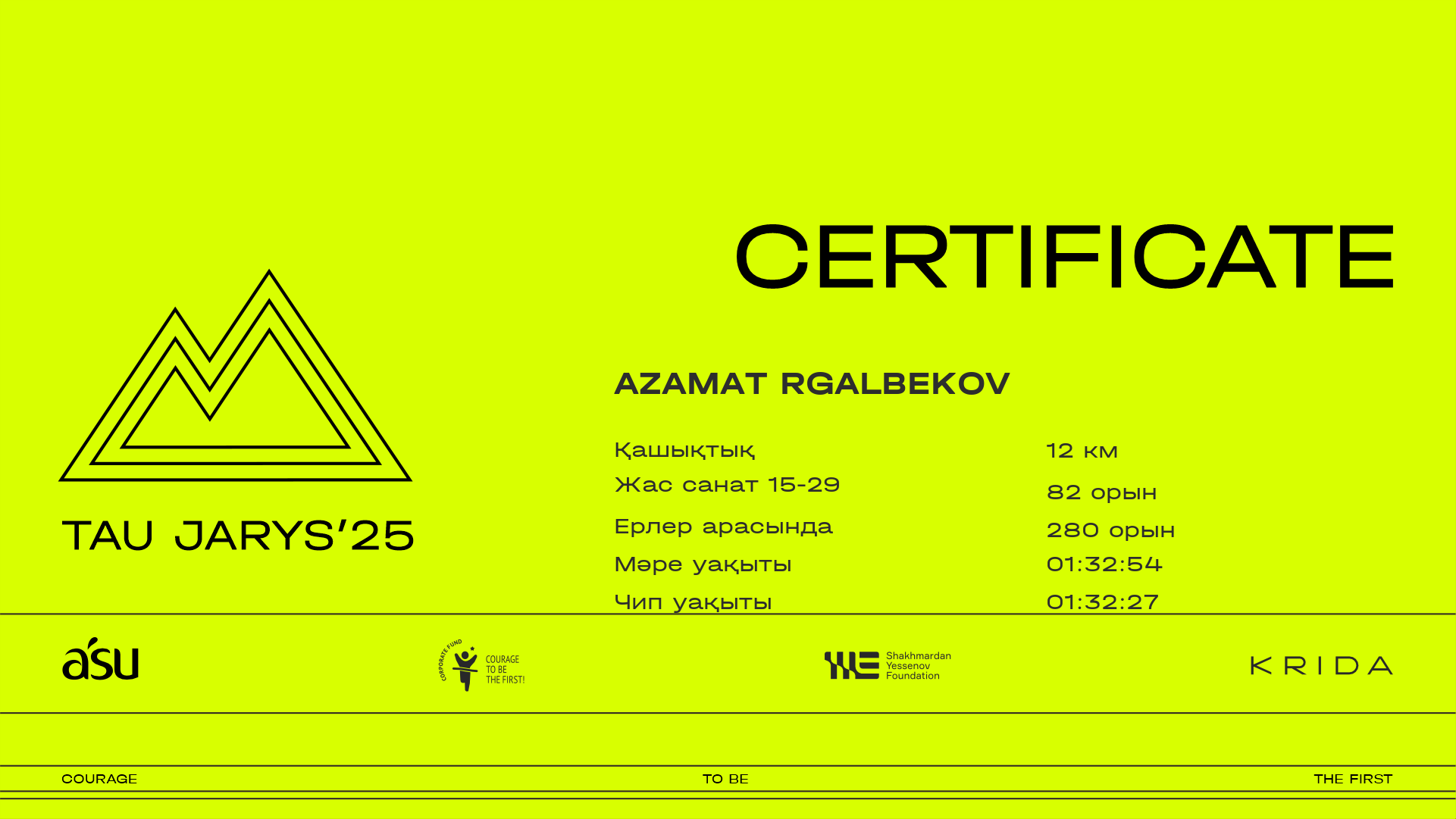 | 351 | Berik Musahanov | ![]() | Almaty | 106 | 00:10:18.90 | 00:27:46.20 | 00:36:32.30 | 00:57:43.40 | 01:16:11.20 | 01:25:43.40 | 01:34:49.40 | 01:34:34.90 | Жүктеп алу |