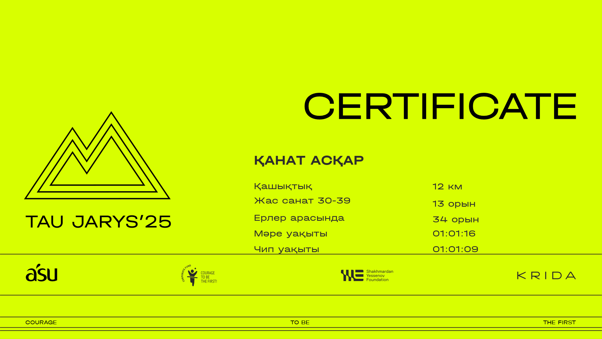 ОрынҚатысушыЕлҚалаНөмір1.4 km3.8 km5 km7.6 km10 km11.2 kmФинишУақыт чипіСертификат
