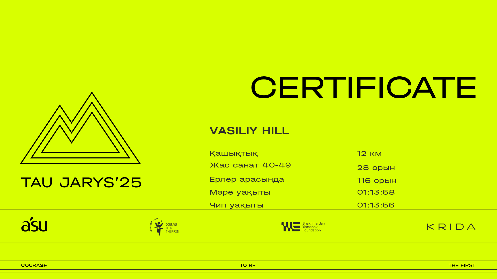 ОрынҚатысушыЕлҚалаНөмір1.4 km3.8 km5 km7.6 km10 km11.2 kmФинишУақыт чипіСертификат