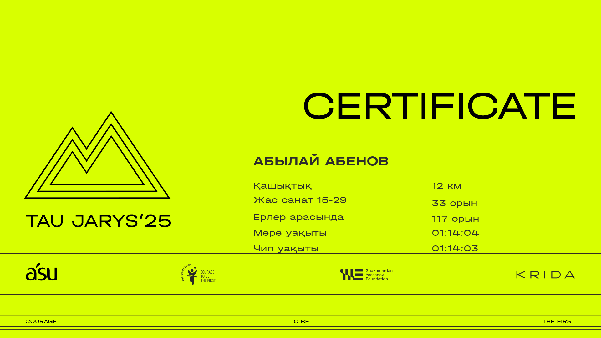 ОрынҚатысушыЕлҚалаНөмір1.4 km3.8 km5 km7.6 km10 km11.2 kmФинишУақыт чипіСертификат
