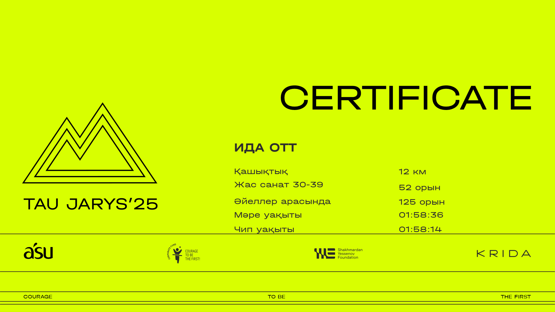 | 388 | Илья Тараненко | ![]() | Алматы | 530 | 00:11:51.10 | 00:30:50.30 | 00:40:09.80 | 01:01:17.40 | 01:21:39.50 | 01:31:12.50 | 01:39:32.10 | 01:39:09.70 | Жүктеп алу |