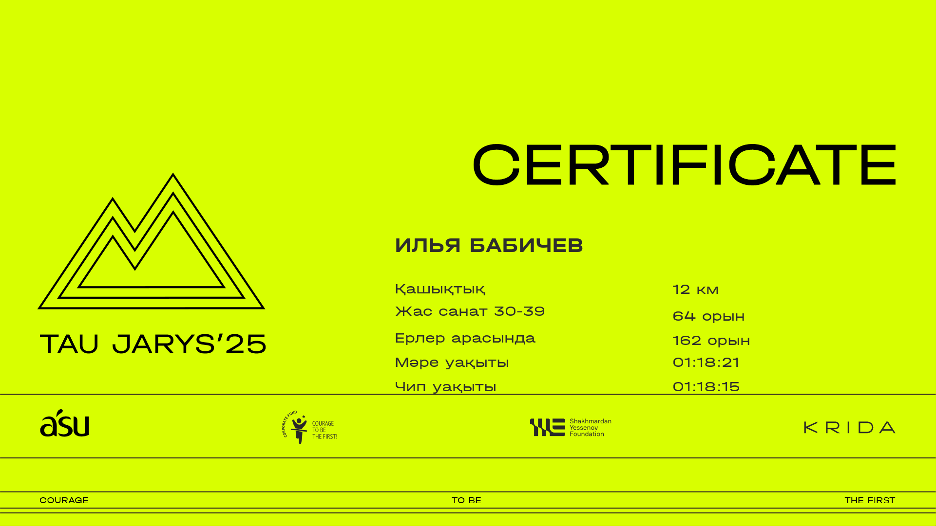 ОрынҚатысушыЕлҚалаНөмір1.4 km3.8 km5 km7.6 km10 km11.2 kmФинишУақыт чипіСертификат
