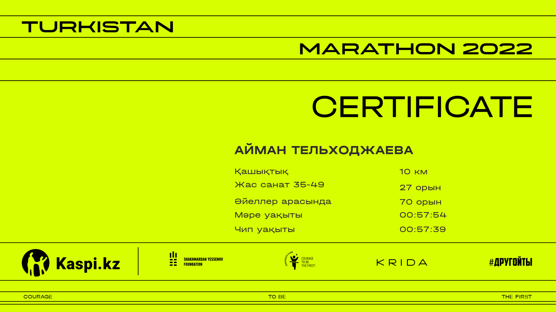 | 295 | Айгуль Тулегенова | ![]() | Алматы | 1427 | 00:28:43.24 | 00:58:03.47 | 00:57:49.09 | Жүктеп алу |