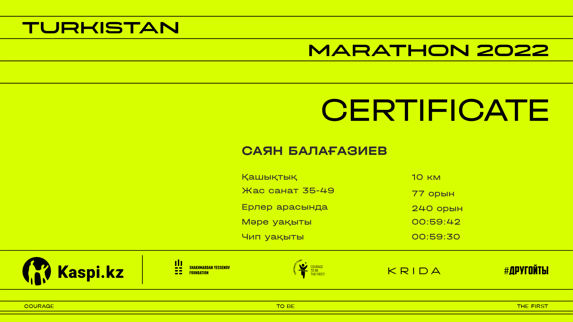 | 327 | Саян Балағазиев | ![]() | Шымкент | 1217 | 00:30:10.74 | 00:59:42.49 | 00:59:30.35 | Жүктеп алу |