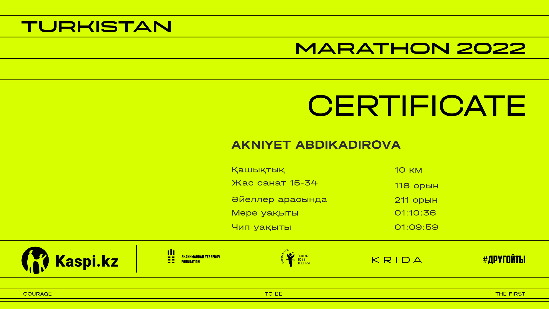 | 553 | Akniyet Abdikadirova | ![]() | Shymkent | 1086 | 00:35:13.95 | 01:10:36.50 | 01:09:59.72 | Жүктеп алу |
