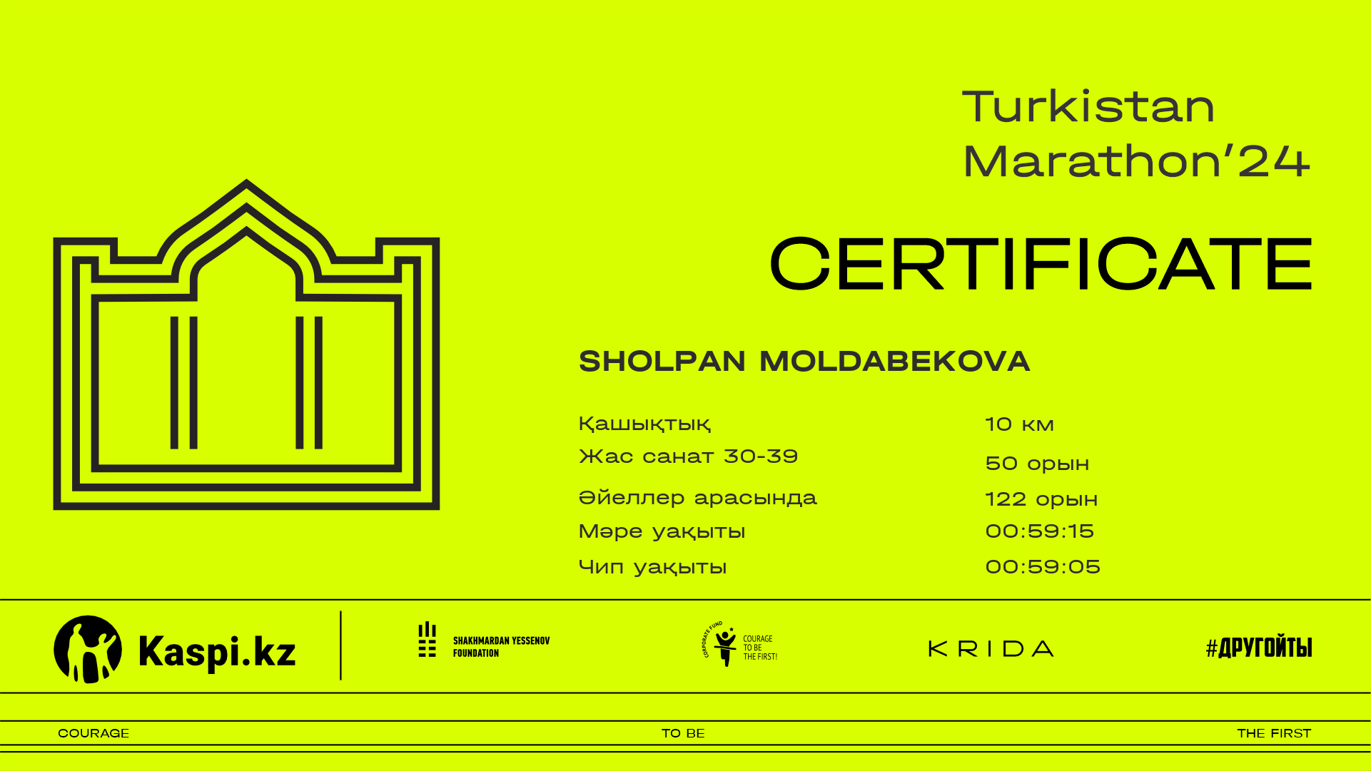 | 1149 | Saule Baitzhaunova | ![]() | Алматы | 1445 | 00:42:34 | 01:26:46 | 01:26:08 | Жүктеп алу |