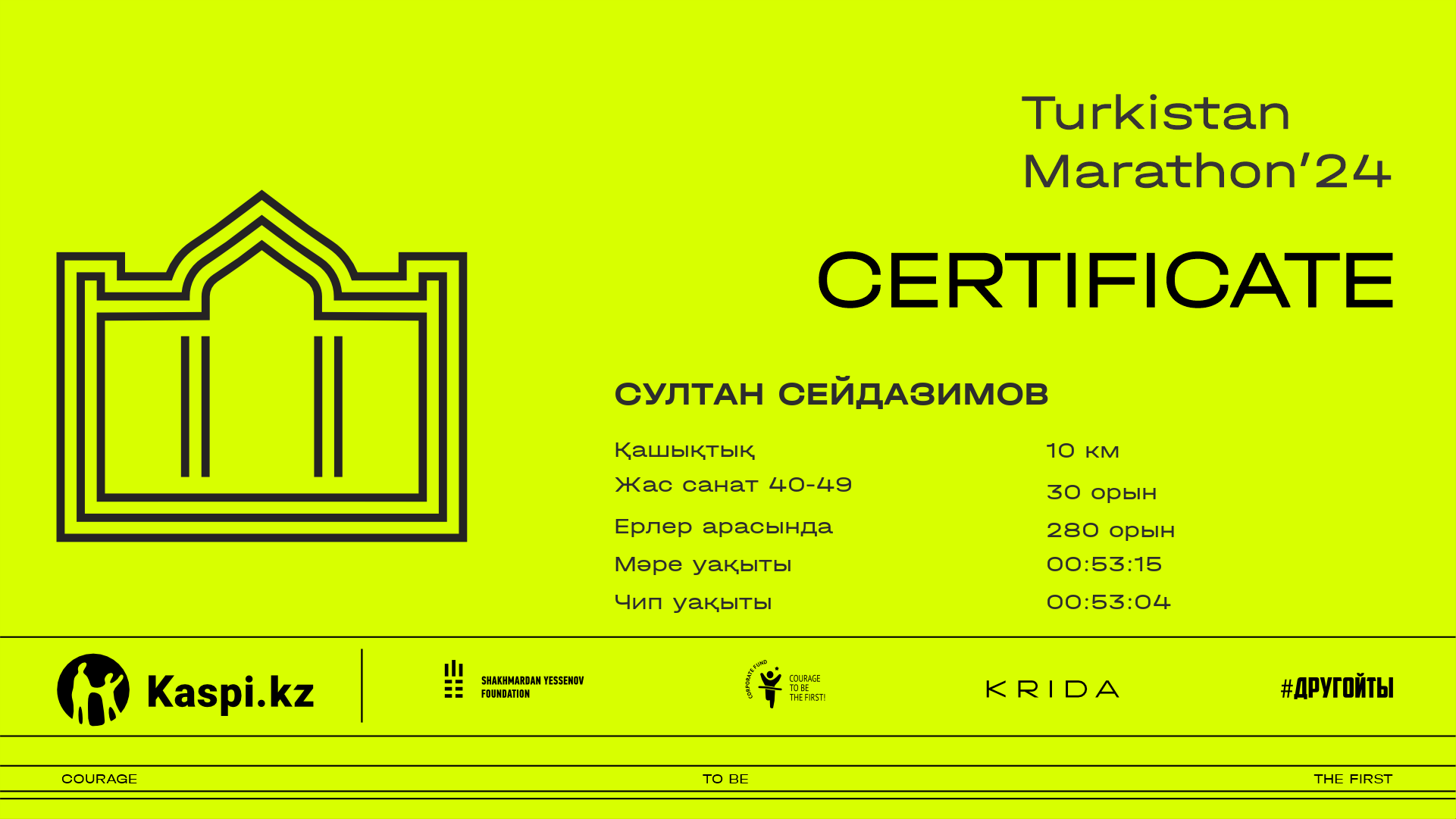 | 1075 | Султан Турысбеков | ![]() | Алматы | 1714 | 00:36:47 | 01:18:27 | 01:18:00 | Жүктеп алу |