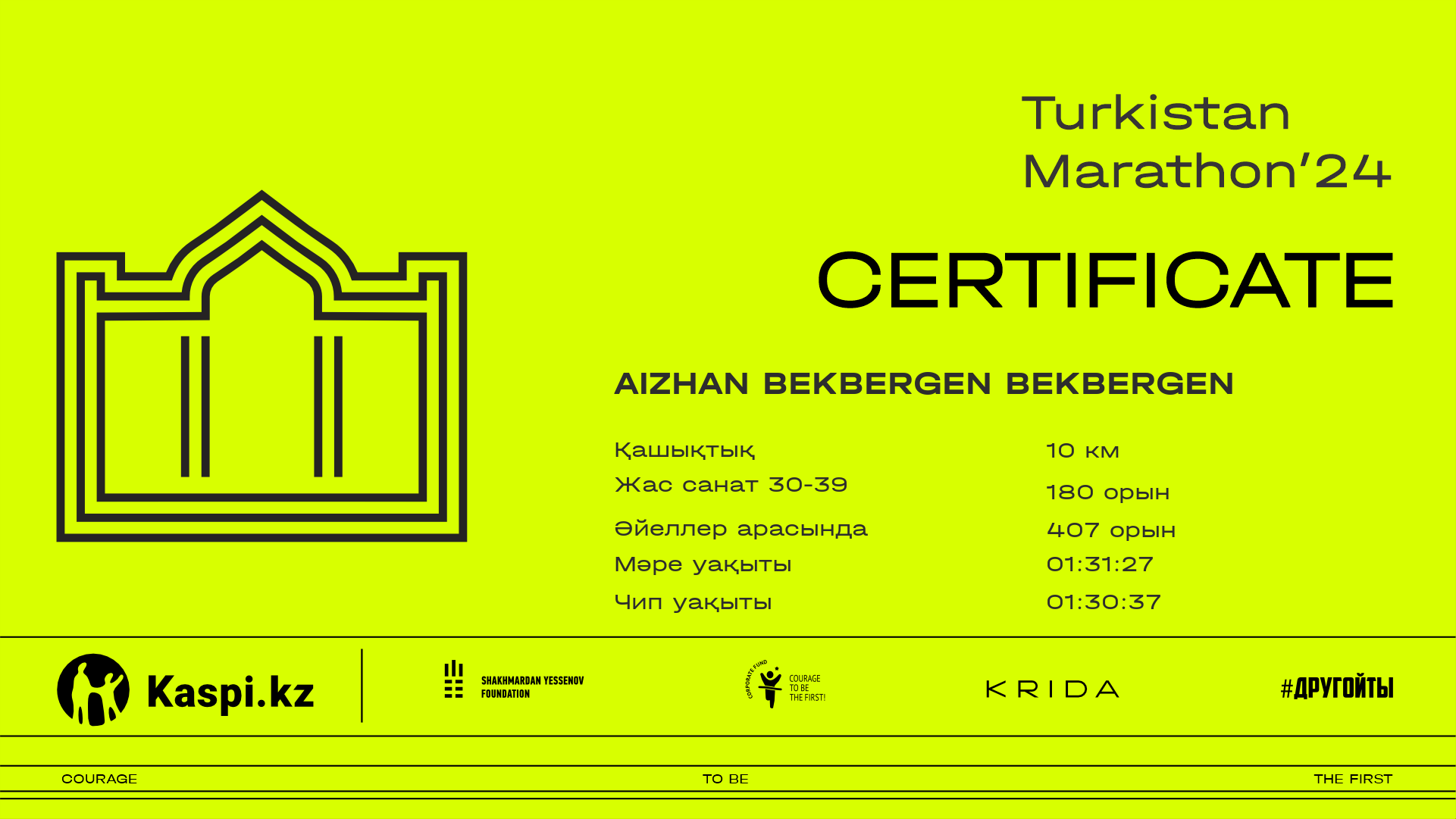 | 1181 | Aizhan Bekbergen Bekbergen | ![]() | Алматы | 2295 | 00:45:17 | 01:31:27 | 01:30:37 | Жүктеп алу |