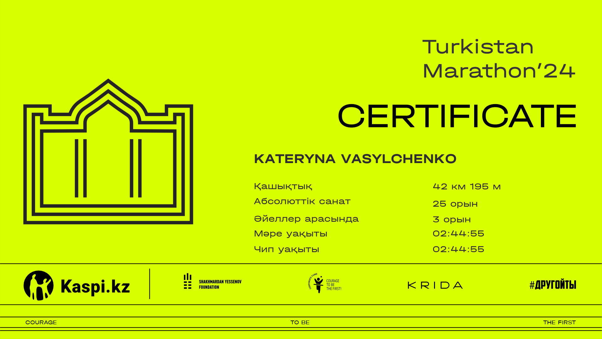 ОрынҚатысушыЕлҚалаНөмір5 km10 km21.1 km31km37 kmФинишУақыт чипіСертификат