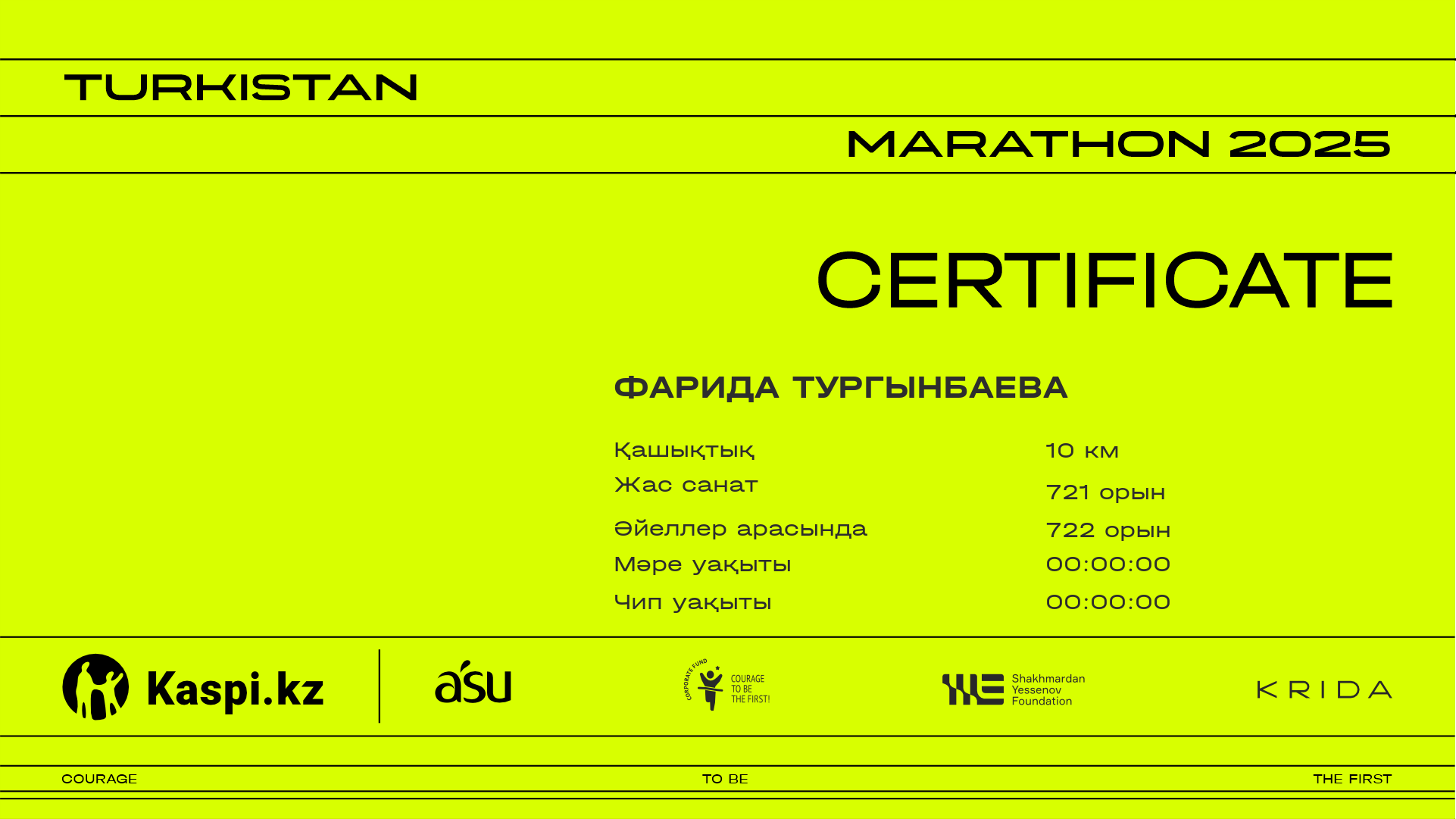 | 1052 | Улбосын Әмірхан | ![]() | Шымкент | 1867 | 01:23:47 | 01:23:10 | Жүктеп алу | |