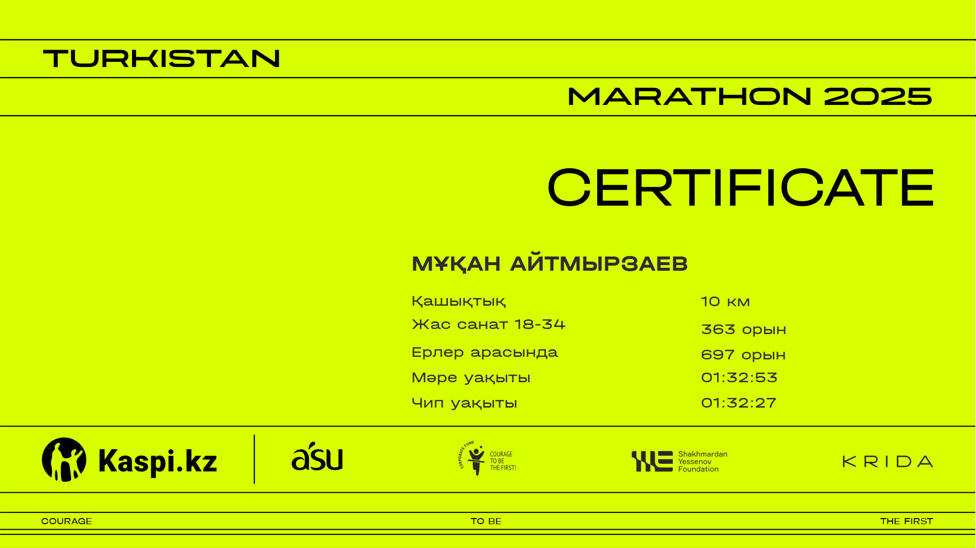 | 1118 | Shahida Nurmahametova | ![]() | Алматы | 1159 | 00:58:23 | 01:34:16 | 01:33:37 | Жүктеп алу |