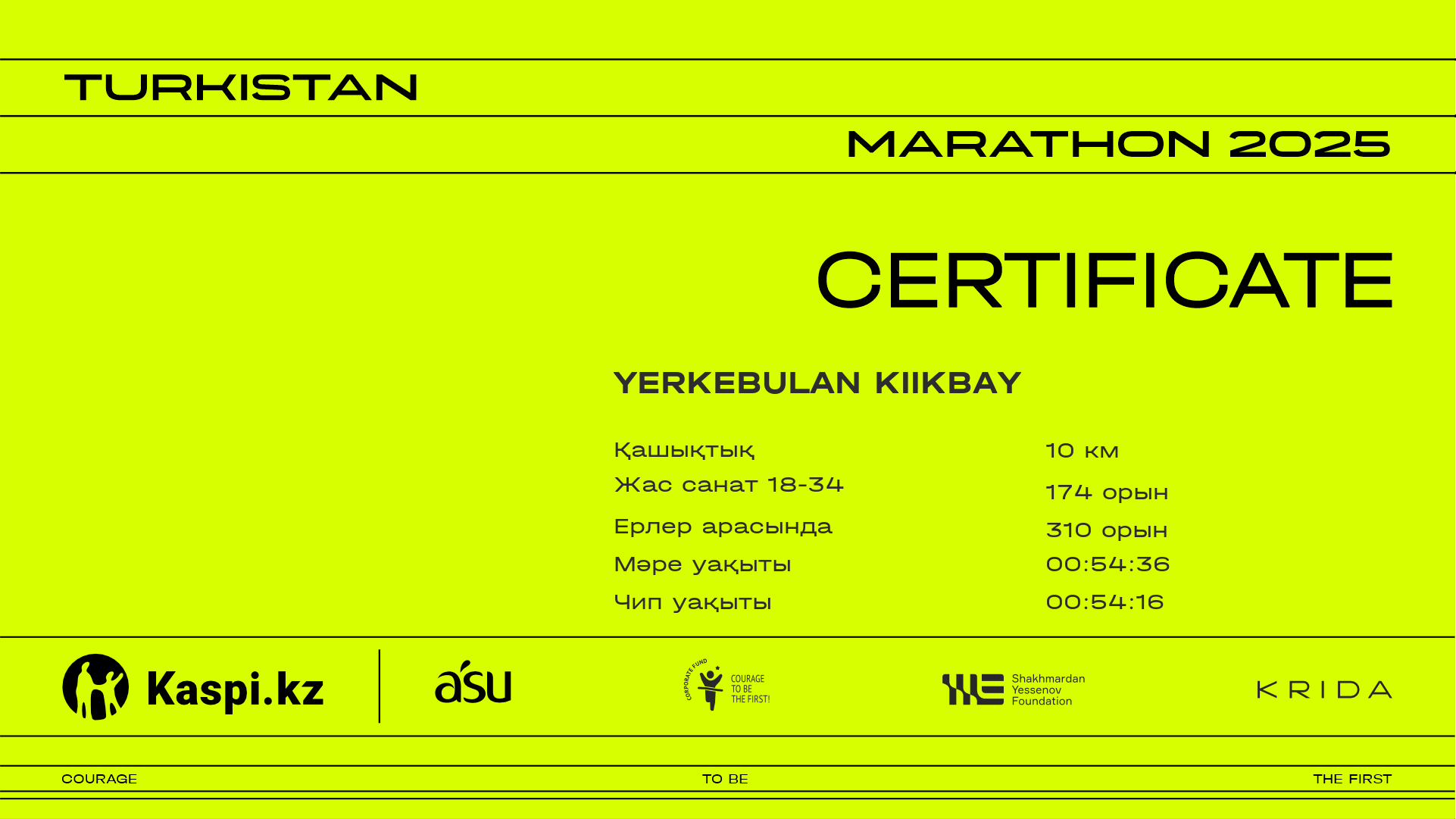 | 1012 | Nurzhan Zhumabayev | ![]() | Алматы | 1472 | 00:54:09 | 01:19:42 | 01:18:59 | Жүктеп алу |