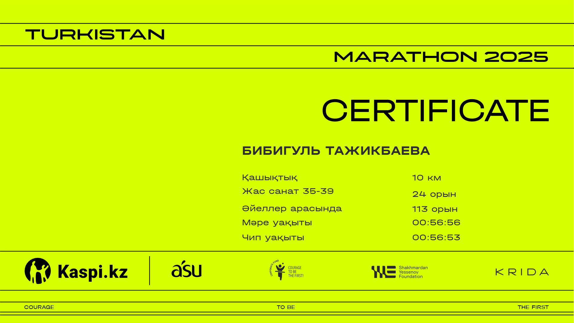 | 1069 | Айзат Сулейменова | ![]() | Алматы | 1125 | 00:53:03 | 01:25:23 | 01:24:33 | Жүктеп алу |