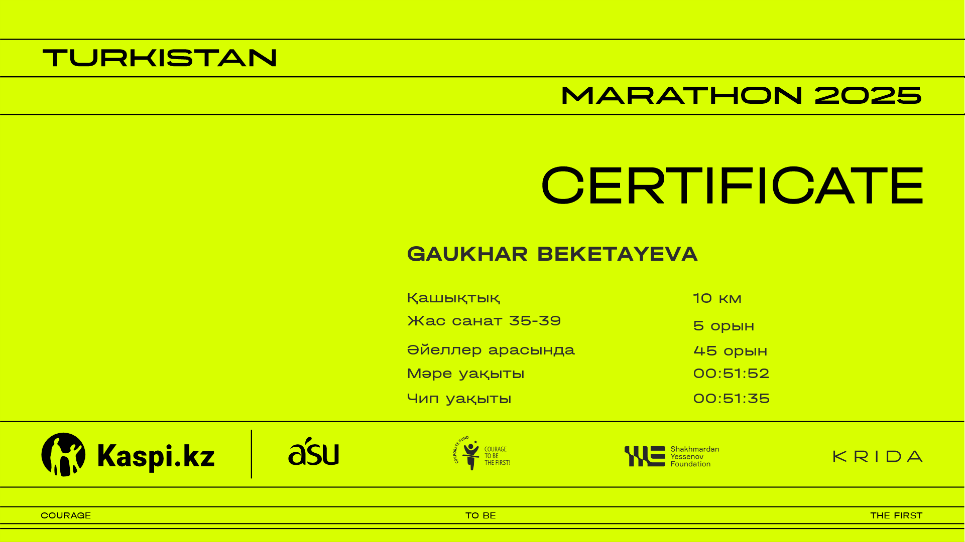 | 1022 | Nazym Shaimerdenova | ![]() | Шымкент | 2030 | 00:50:05 | 01:20:36 | 01:19:50 | Жүктеп алу |