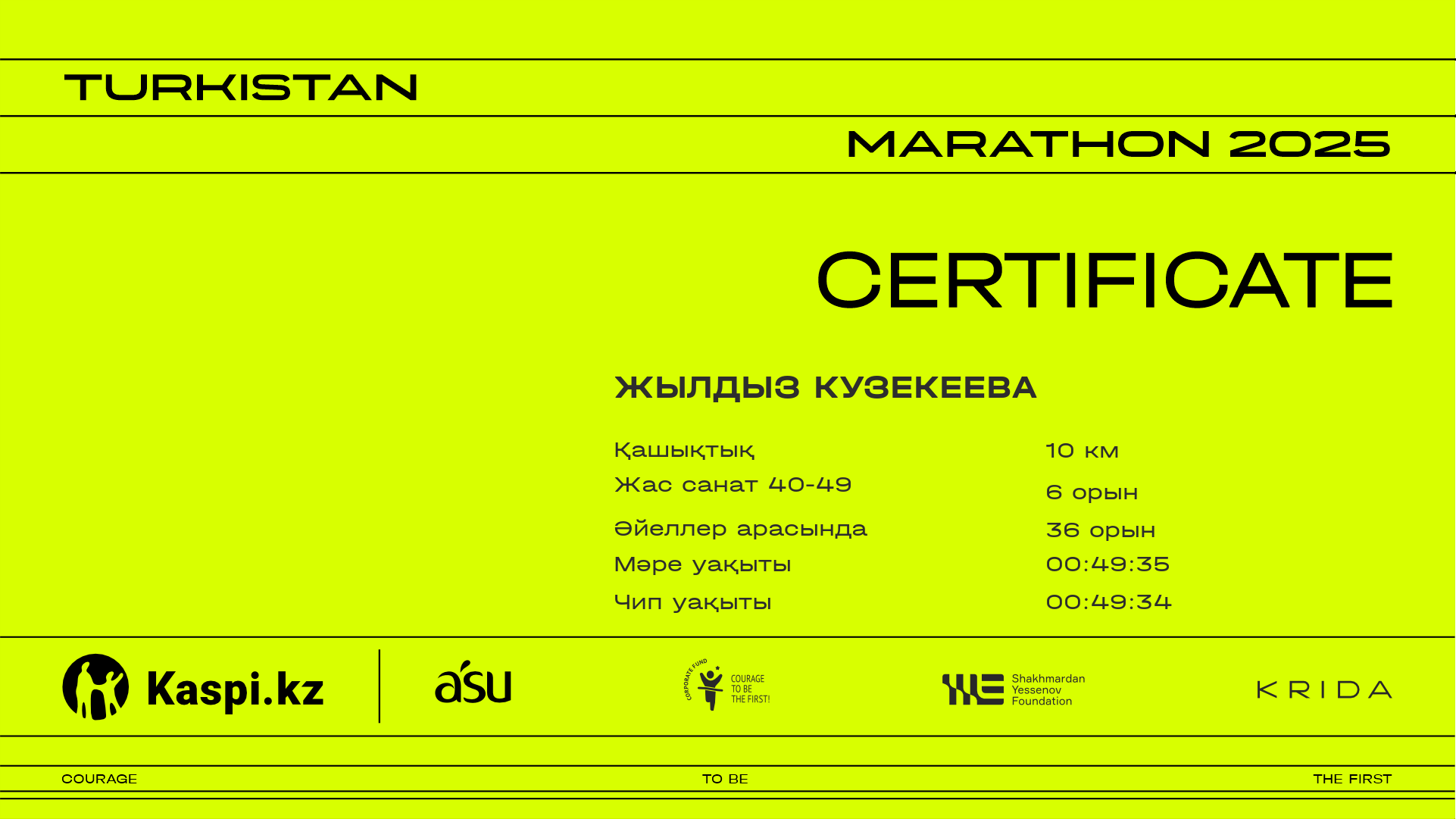 | 245 | Arailym Zholdas | ![]() | Алматы | 1903 | 00:30:36 | 00:49:47 | 00:49:34 | Жүктеп алу |
